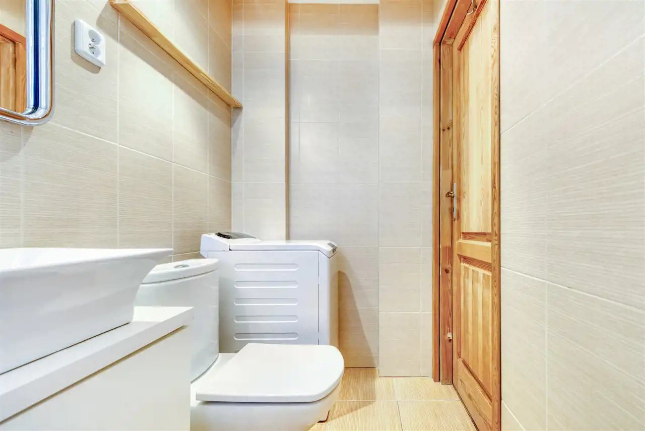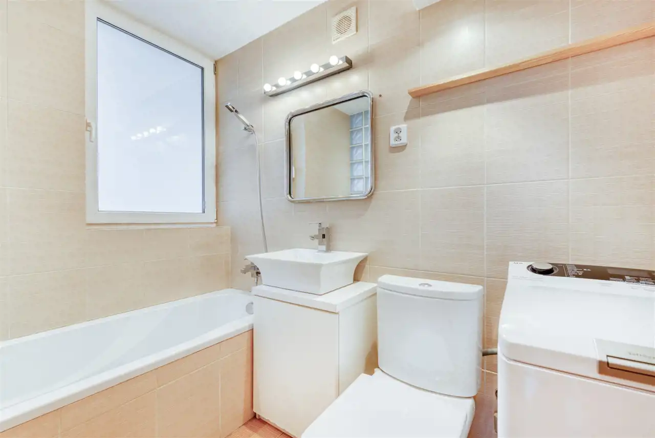 - nowoczesną łazienkę z WC wyposażoną w wannę oraz pralkę;