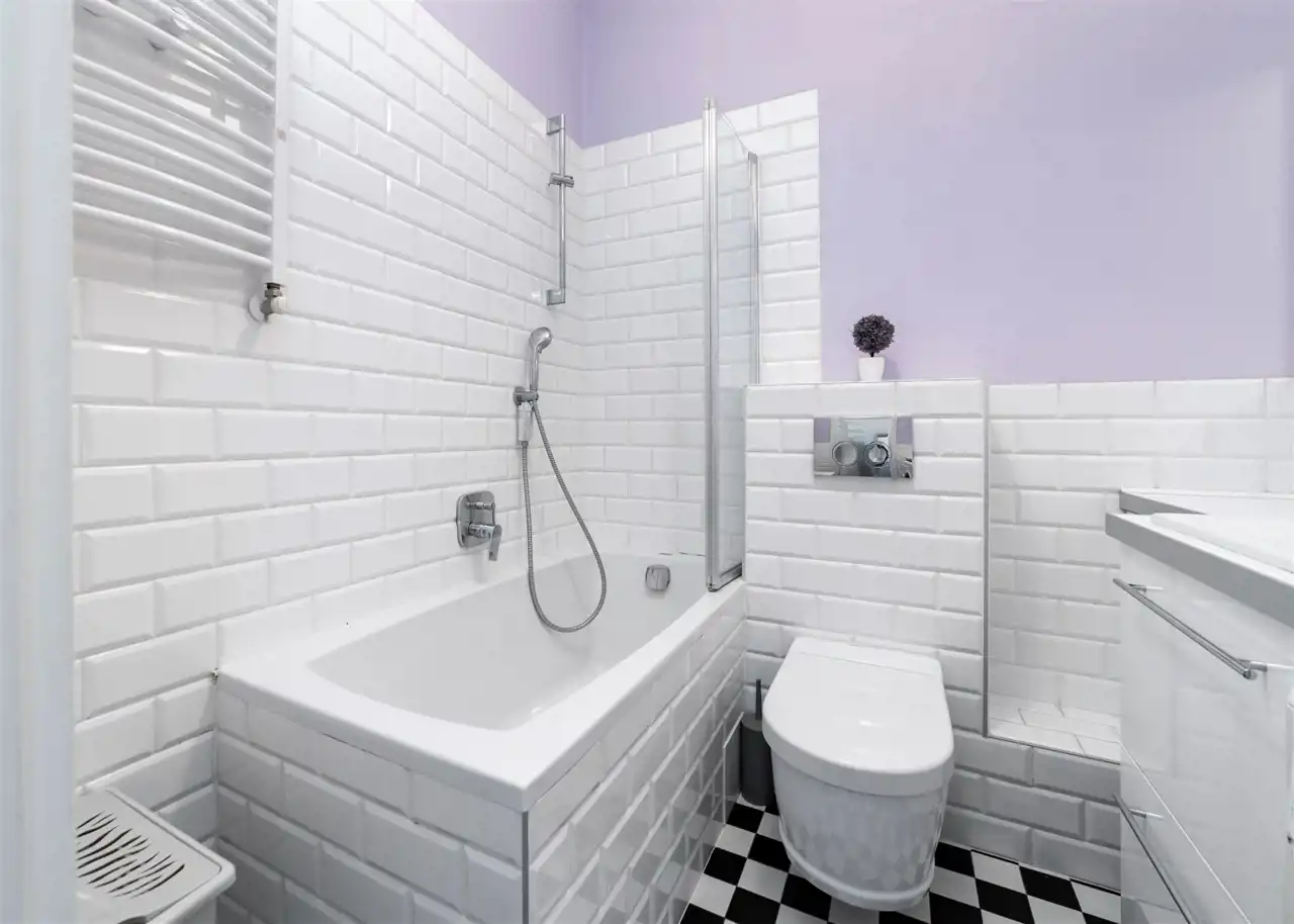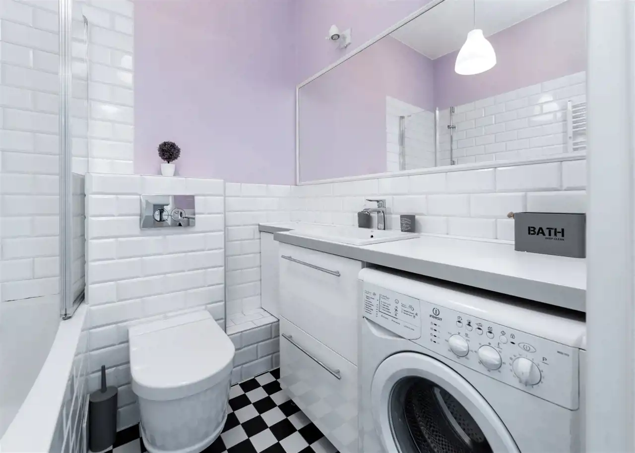 - nowoczesną łazienkę z WC wyposażoną w wannę z funkcją natrysku oraz pralkę;