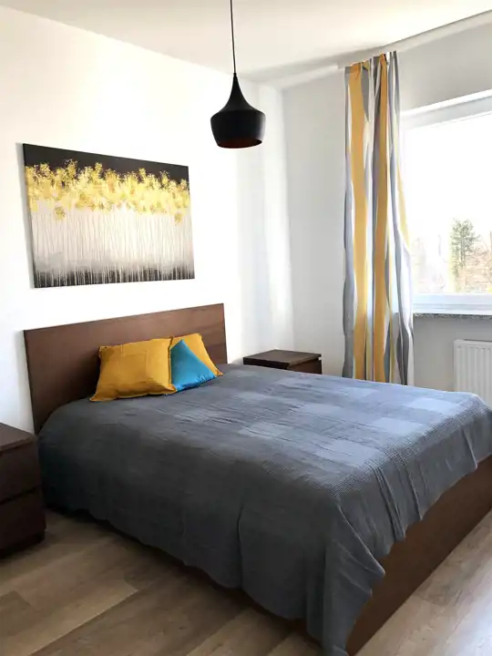 - SYPIALNIA: ściany gładzie gipsowe, gres, łóżko 2-osobowe, komoda z szufladami , 2 szafki nocne, okno PCV