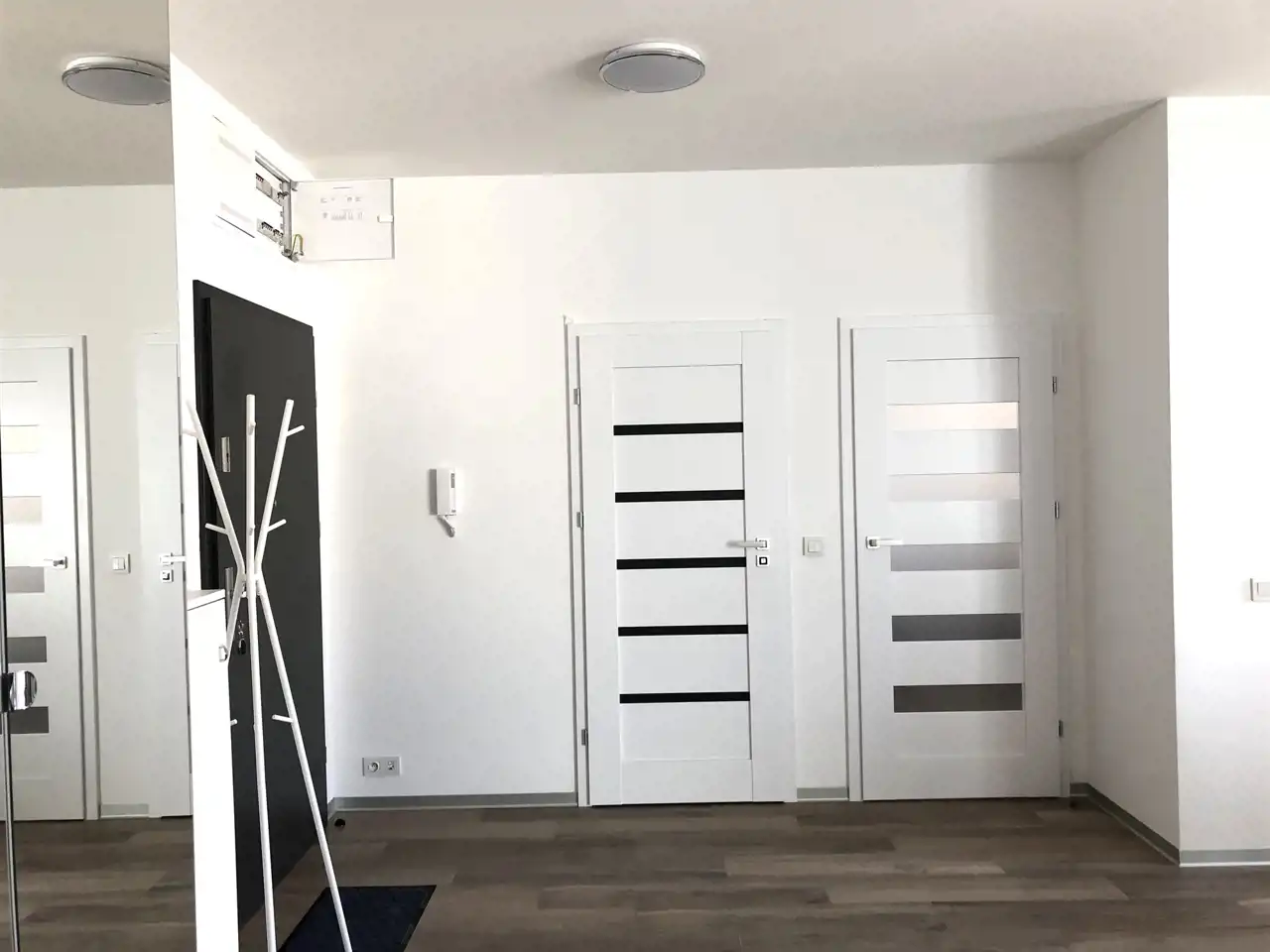 - PRZEDPOKÓJ: drzwi zewnętrzne antywłamaniowe, ściany gładzie gipsowe, podłoga gres, szafka na buty, wieszaki na płaszcze,