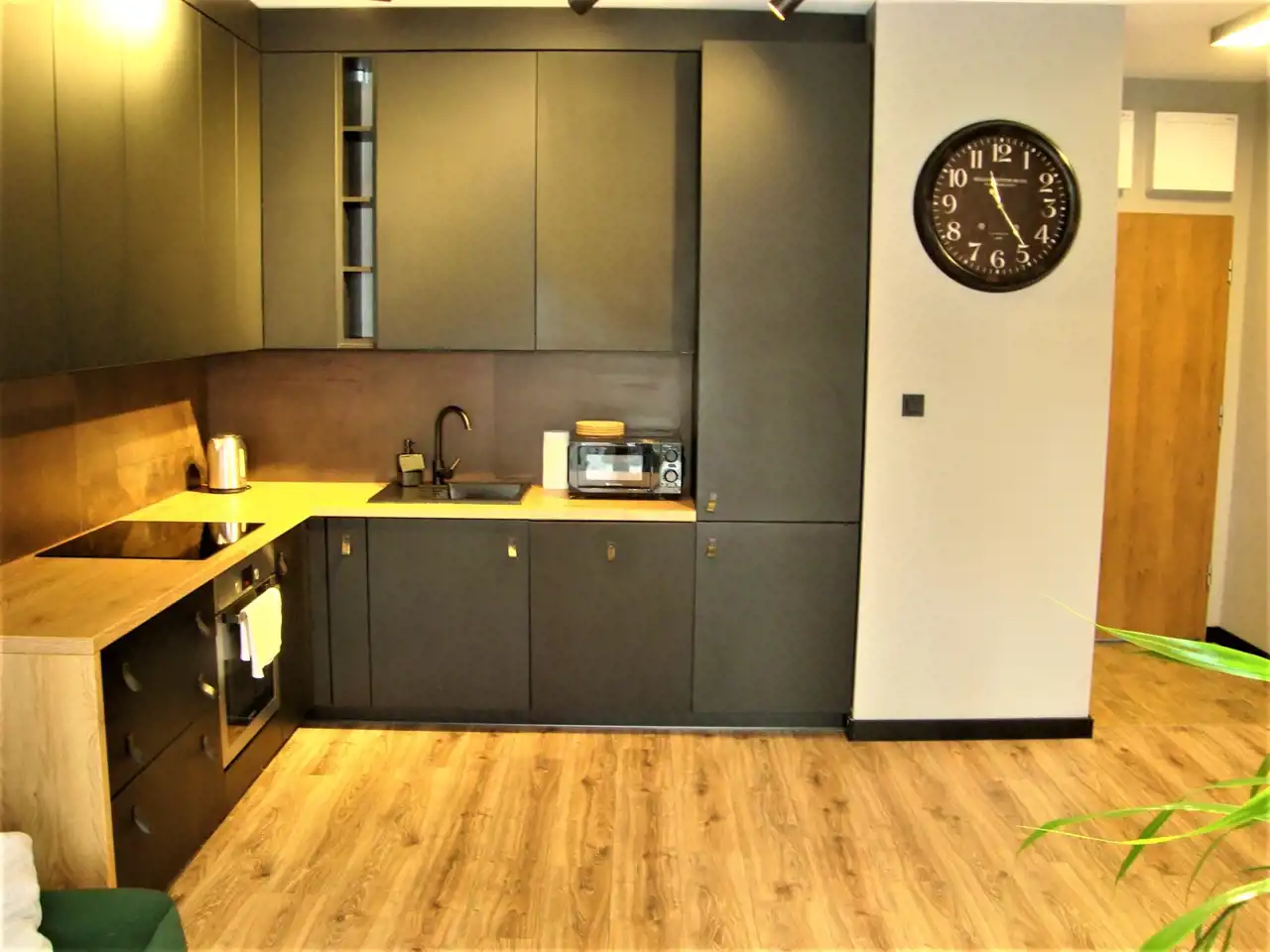 kuchnia: lodówka, zmywarka, piekarnik, płyta indukcyjna, mikrofalówka, nowoczesna zabudowa kuchenna