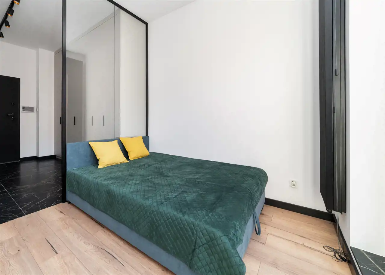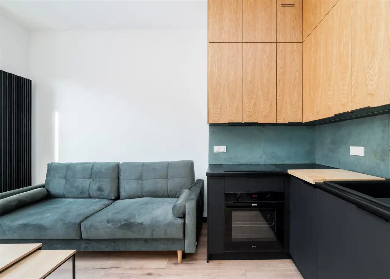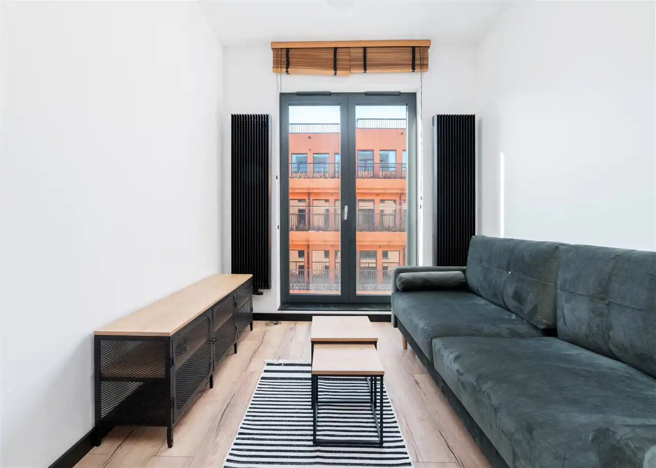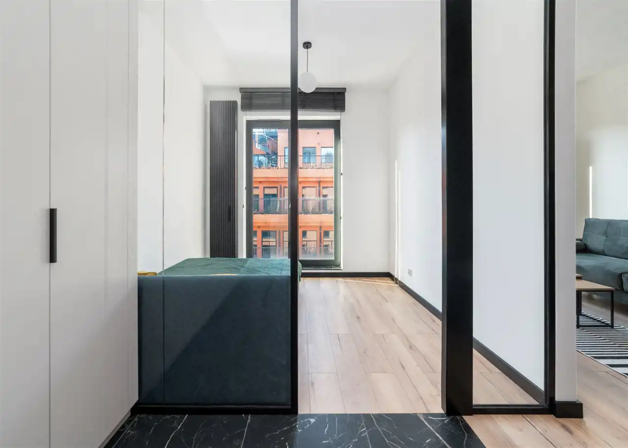 - pokój dzienny (wyposażony w rozkładaną sofę, stolik, komodę) z oknami eksponującymi luksusowe wnętrze osiedla. Duże przeszklenia gwarantują doskonałe doświetlenie wnętrza;