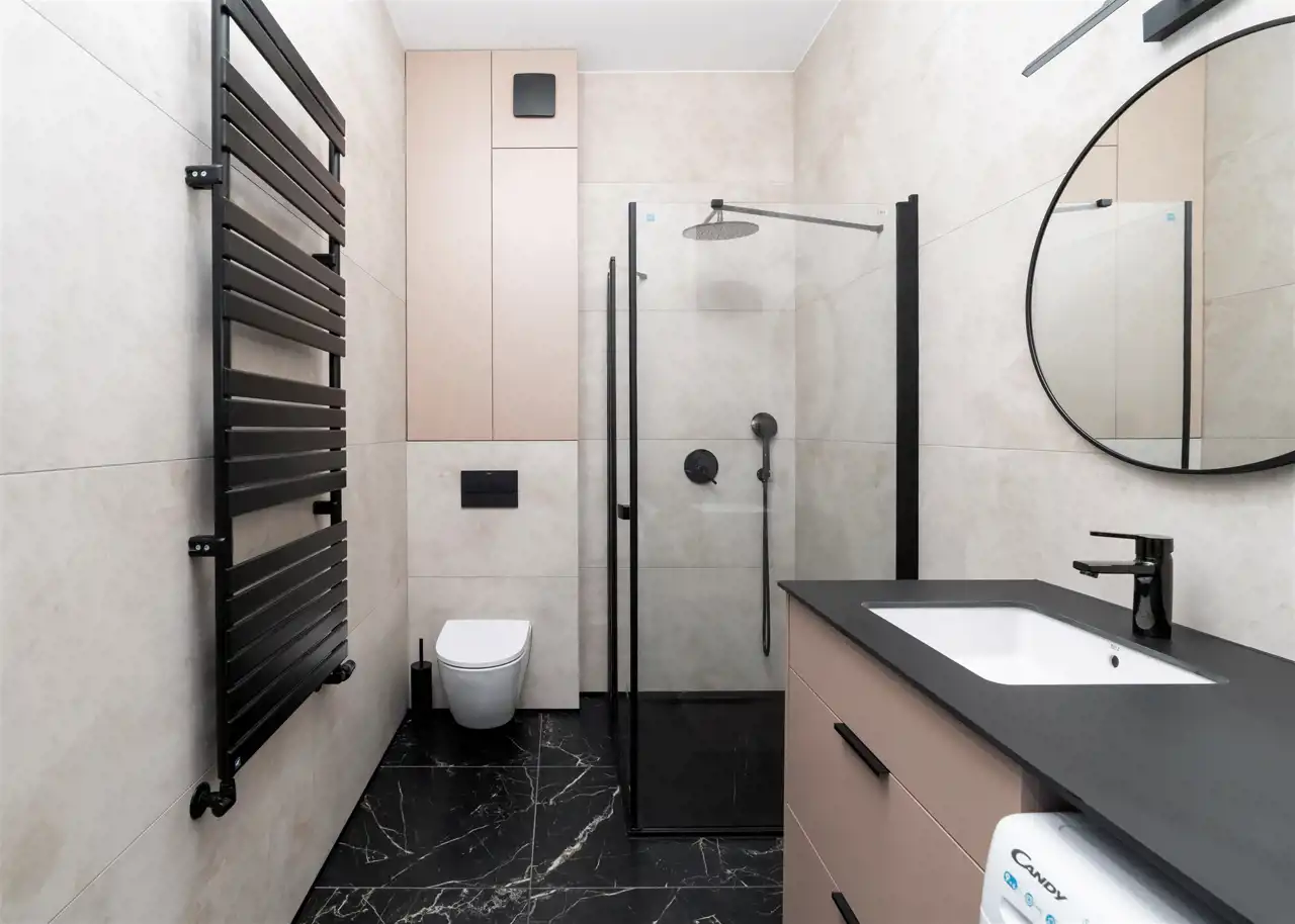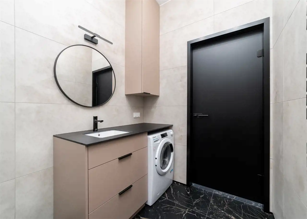 - świetnie zaprojektowaną łazienkę z WC wyposażoną prysznic walk-in, pralko-suszarkę, umywalkę;