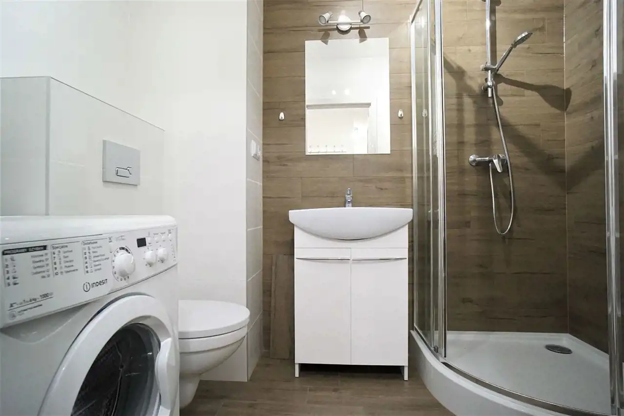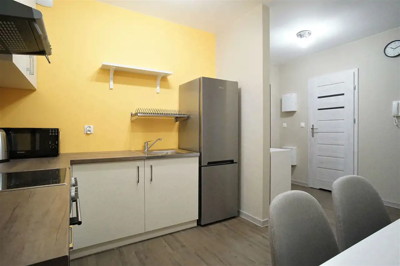 W pełni wyposażone - w obu pokojach znajdziemy wygodną rozkładaną kanapę narożną, szafkę RTV, komodę, regał oraz pakowną szafę z lustrem. Kuchnia wyposażona we wszystkie niezbędne sprzęty i akcesoria - lodówka, zamrażarka, piekarnik, płyta indukcyjna. W łazience prysznic, WC, umywalka, pralka.