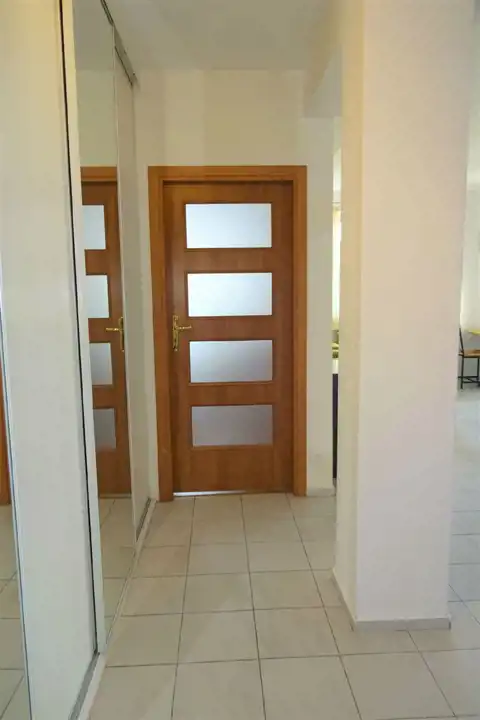 - PRZEDPOKÓJ: hall otwarty na salon, szafy zabudowane typu Komandor z lustrzanymi drzwiami, jasna terakota