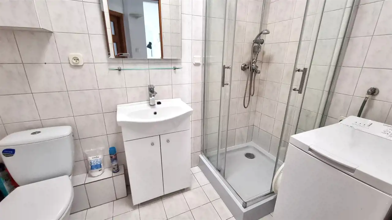 - ŁAZIENKA: razem z wc, jasna glazura, terakota, kabina prysznicowa, pralka automatyczna
