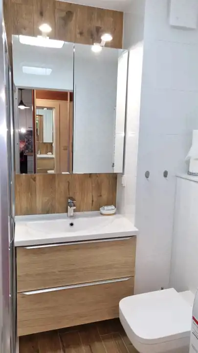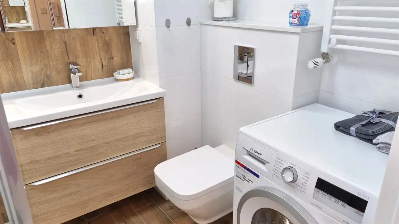 - ŁAZIENKA z WC 3,79 m : terakota, glazura, kabina prysznicowa, sedes podwieszany, umywalka z szafką, szafka z lustrem, pralka BOSCH