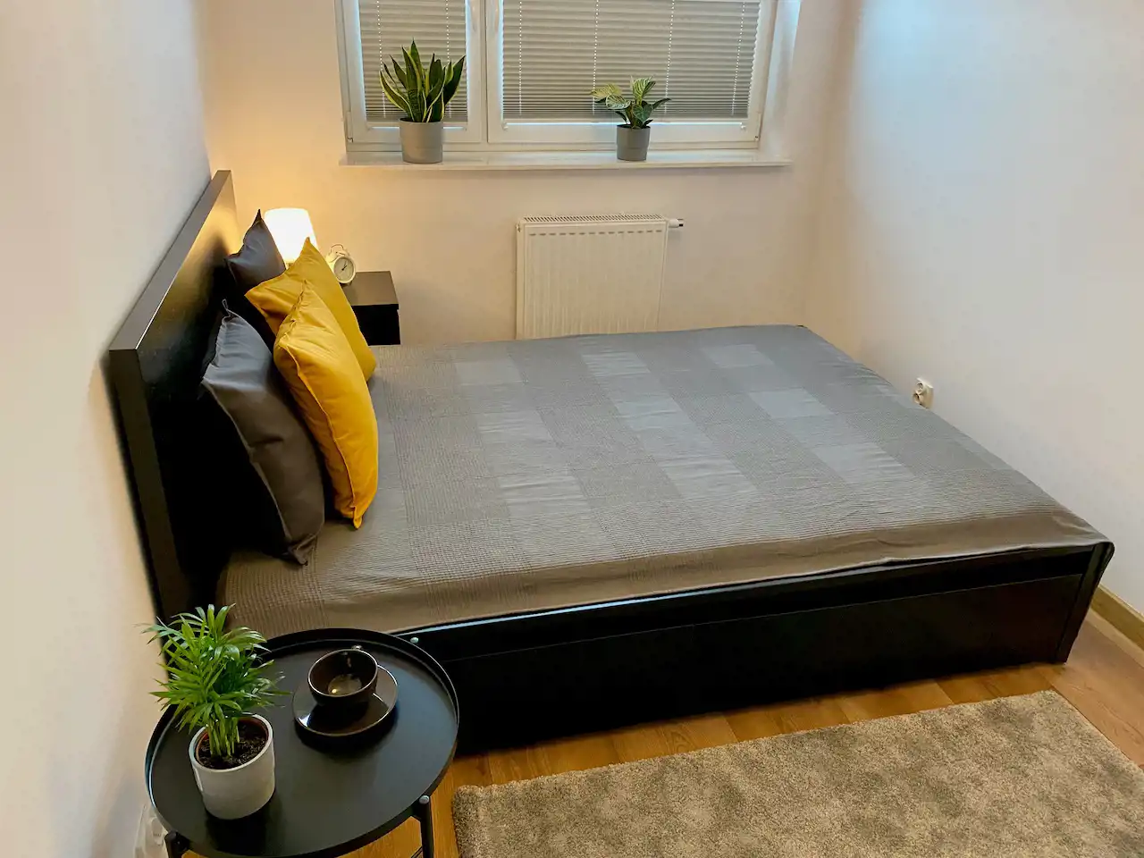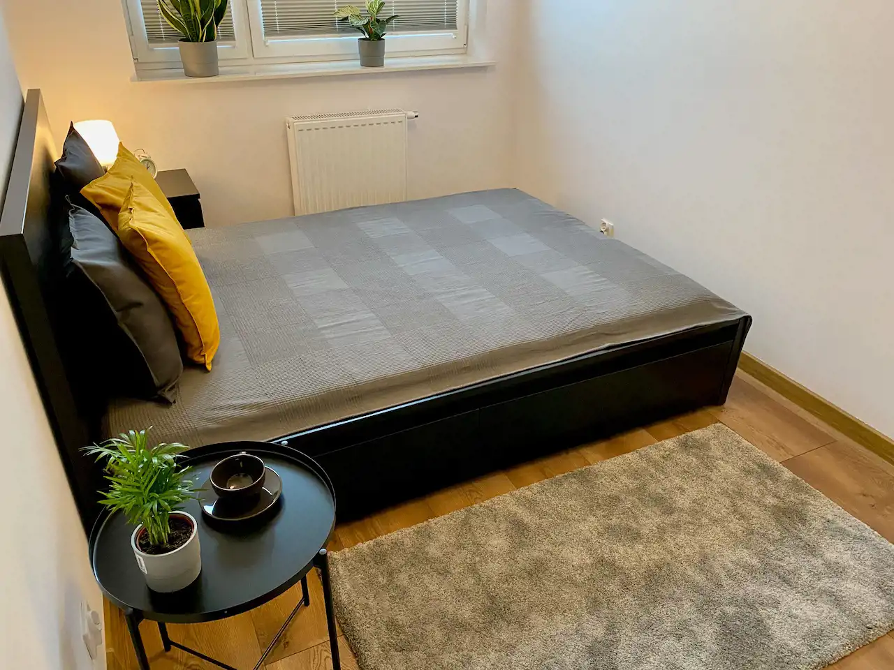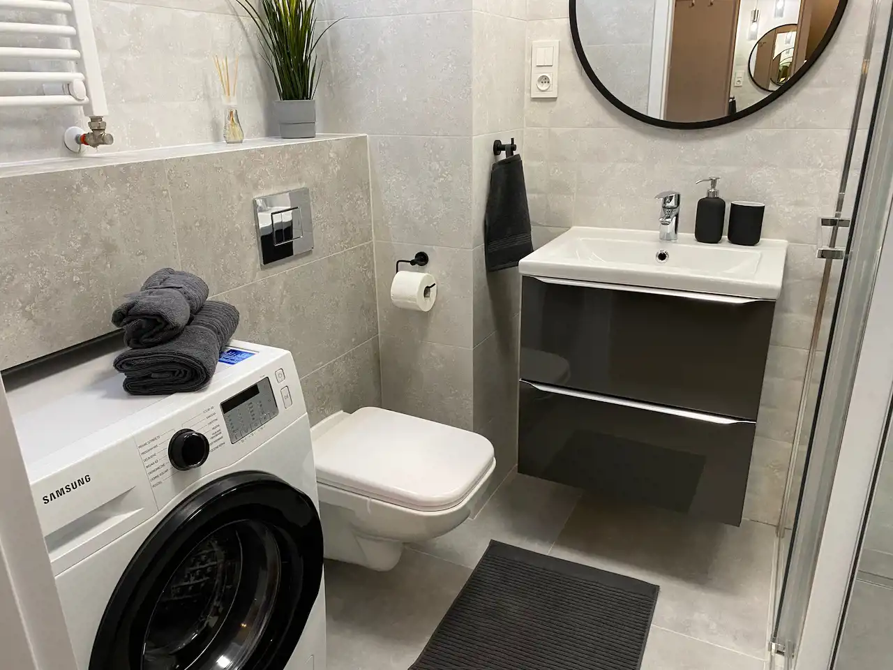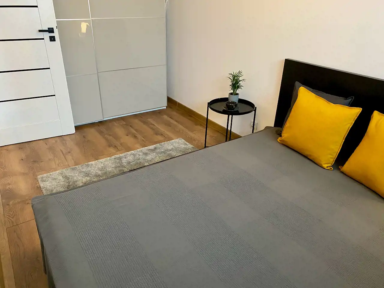 W mieszkaniu mamy wygodny salon z aneksem kuchennym, osobną sypialnię, łazienkę i hol. Jest tutaj kompletnie umeblowana i wyposażona kuchnia - meble pod wymiar, lodówko-zamrażarka, zmywarka, płyta indukcyjna, piekarnik, mikrofala i wyciąg. Drobne wyposażenie. W pokoju dziennym rozkładana sofa, komody, telewizor LCD Smart, niski stolik kawowy i wyjście na słoneczny balkon. W sypialni duża szafa, łóżko dwu osobowe i stoliki nocne. Łazienka z nowoczesną aranżacją z kabiną prysznicową, toaletą, umywalką i pralką. Hol z wieszakami.