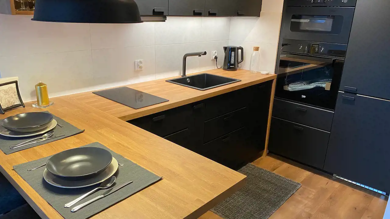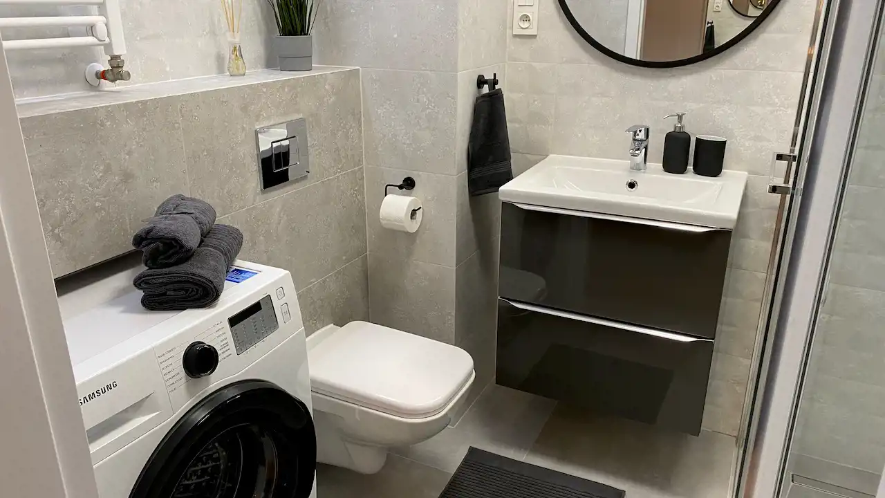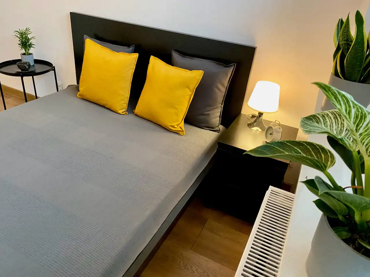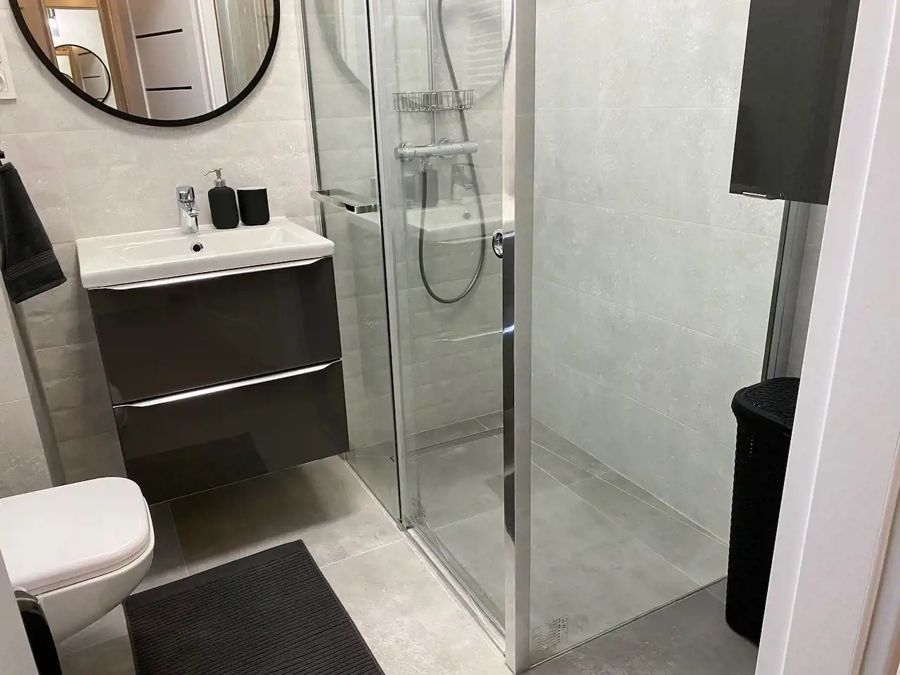 W mieszkaniu mamy wygodny salon z aneksem kuchennym, osobną sypialnię, łazienkę i hol. Jest tutaj kompletnie umeblowana i wyposażona kuchnia - meble pod wymiar, lodówko-zamrażarka, zmywarka, płyta indukcyjna, piekarnik, mikrofala i wyciąg. Drobne wyposażenie. W pokoju dziennym rozkładana sofa, komody, telewizor LCD Smart, niski stolik kawowy i wyjście na słoneczny balkon. W sypialni duża szafa, łóżko dwu osobowe i stoliki nocne. Łazienka z nowoczesną aranżacją z kabiną prysznicową, toaletą, umywalką i pralką. Hol z wieszakami.