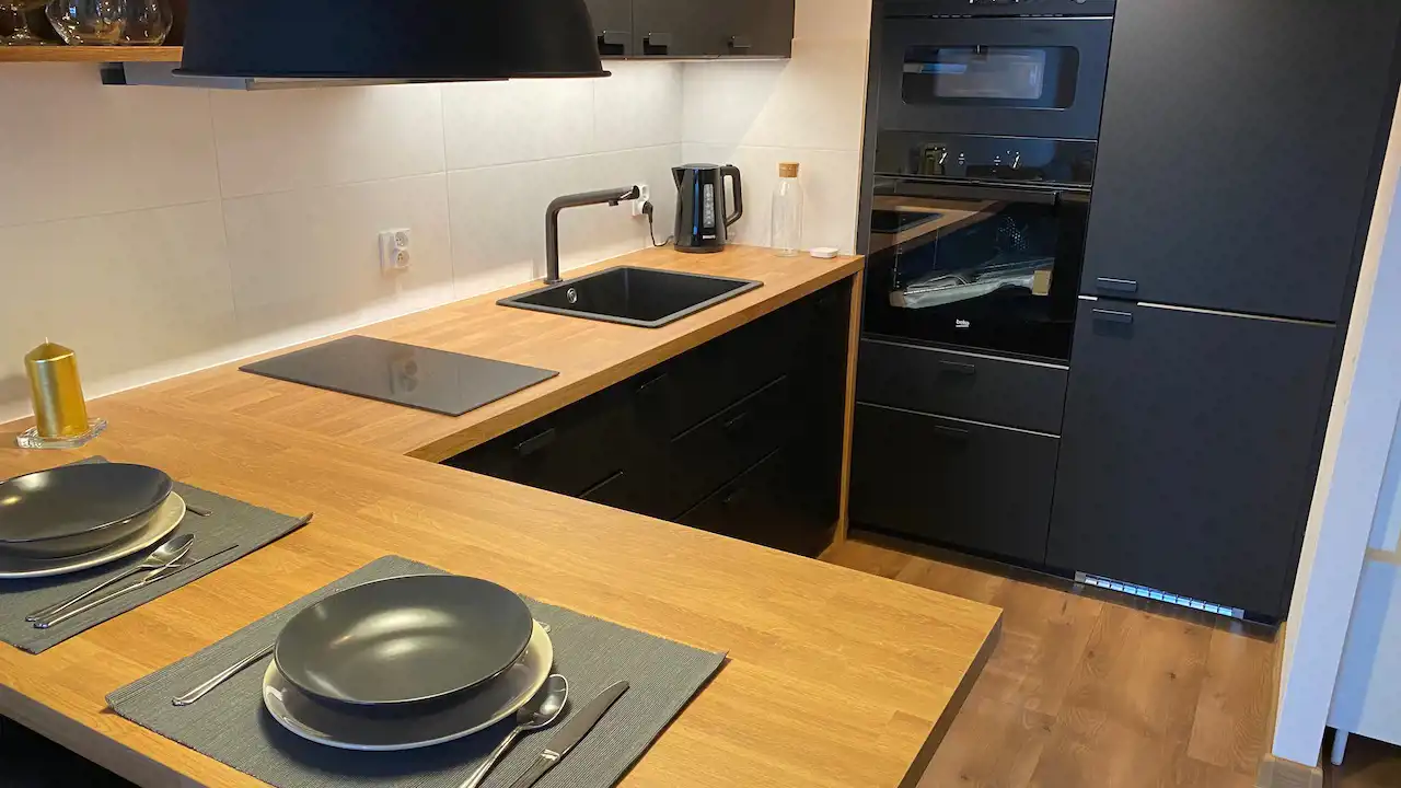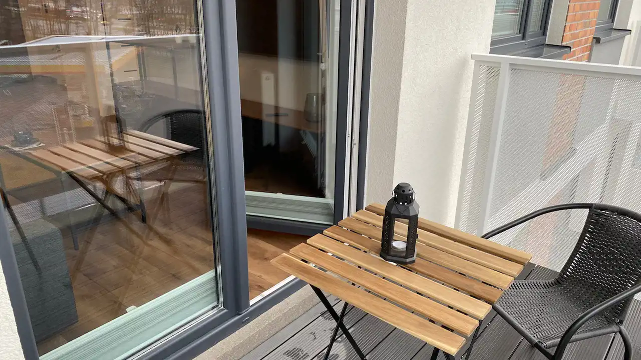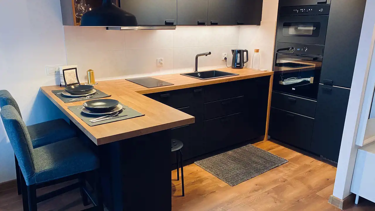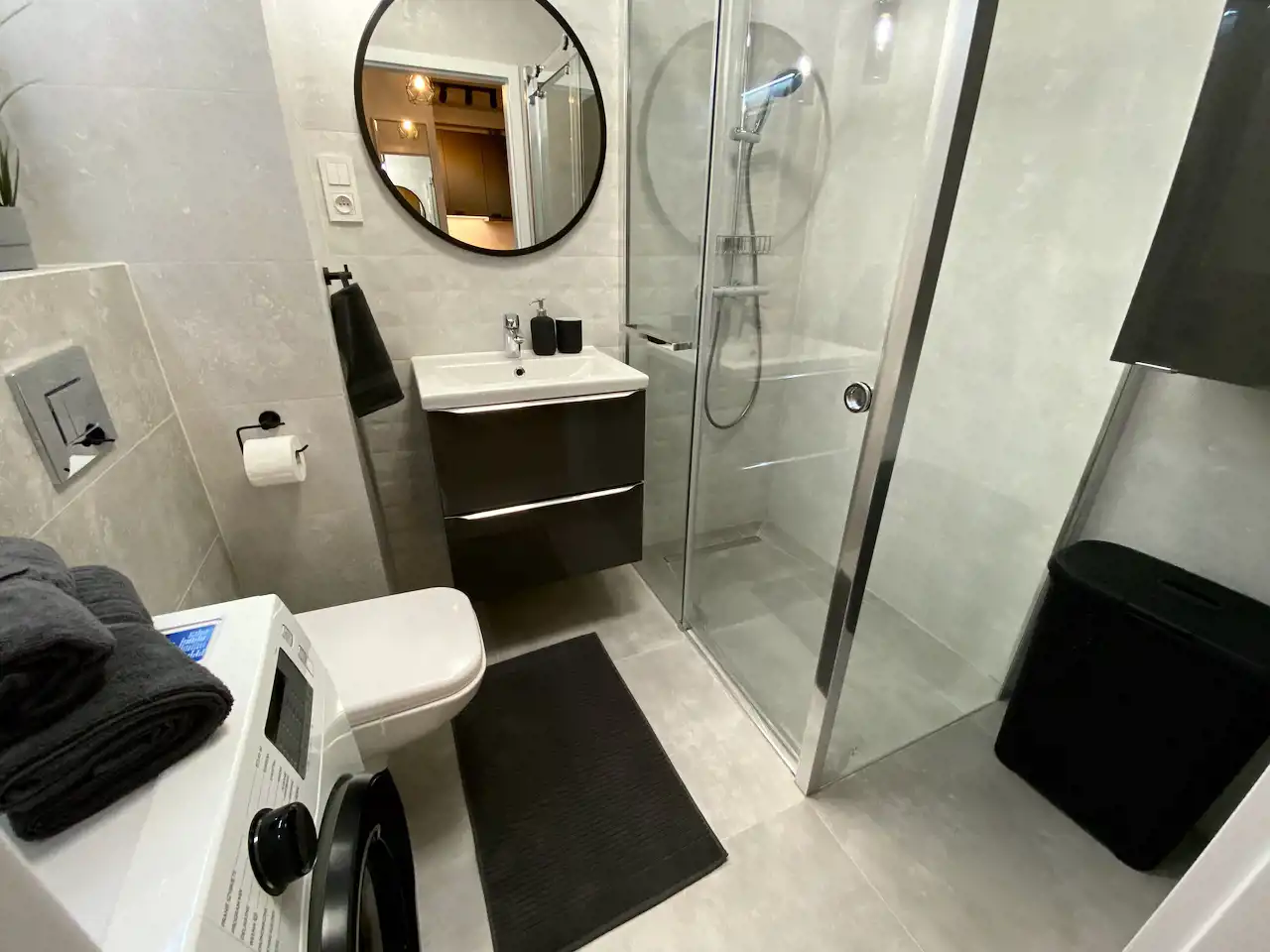 W mieszkaniu mamy wygodny salon z aneksem kuchennym, osobną sypialnię, łazienkę i hol. Jest tutaj kompletnie umeblowana i wyposażona kuchnia - meble pod wymiar, lodówko-zamrażarka, zmywarka, płyta indukcyjna, piekarnik, mikrofala i wyciąg. Drobne wyposażenie. W pokoju dziennym rozkładana sofa, komody, telewizor LCD Smart, niski stolik kawowy i wyjście na słoneczny balkon. W sypialni duża szafa, łóżko dwu osobowe i stoliki nocne. Łazienka z nowoczesną aranżacją z kabiną prysznicową, toaletą, umywalką i pralką. Hol z wieszakami.