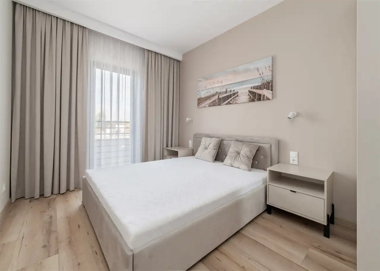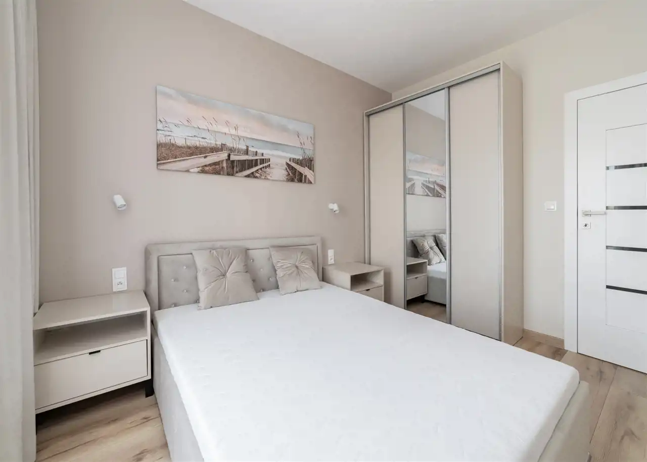- komfortową sypialnię z wygodnym łóżkiem i pojemną szafą;