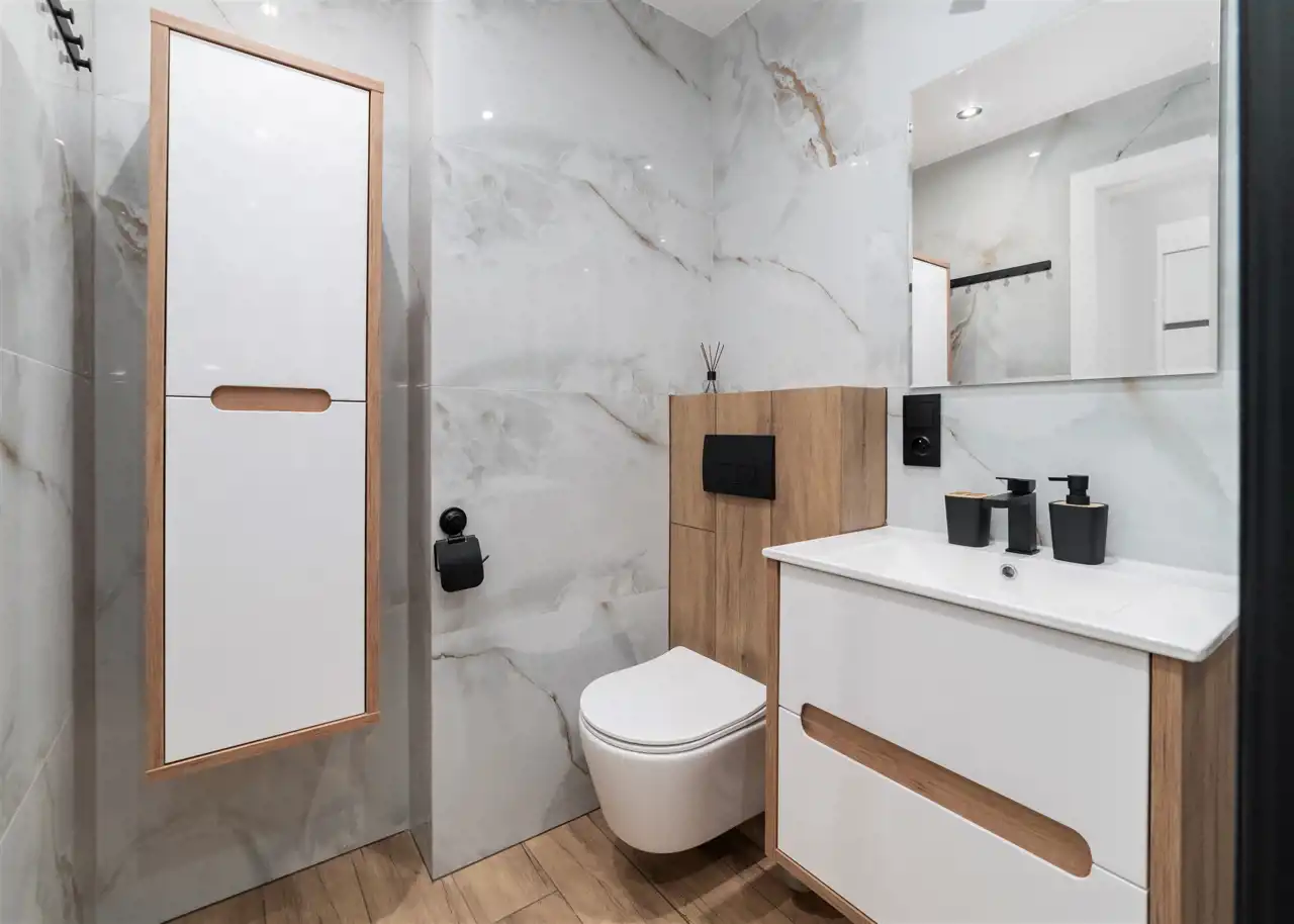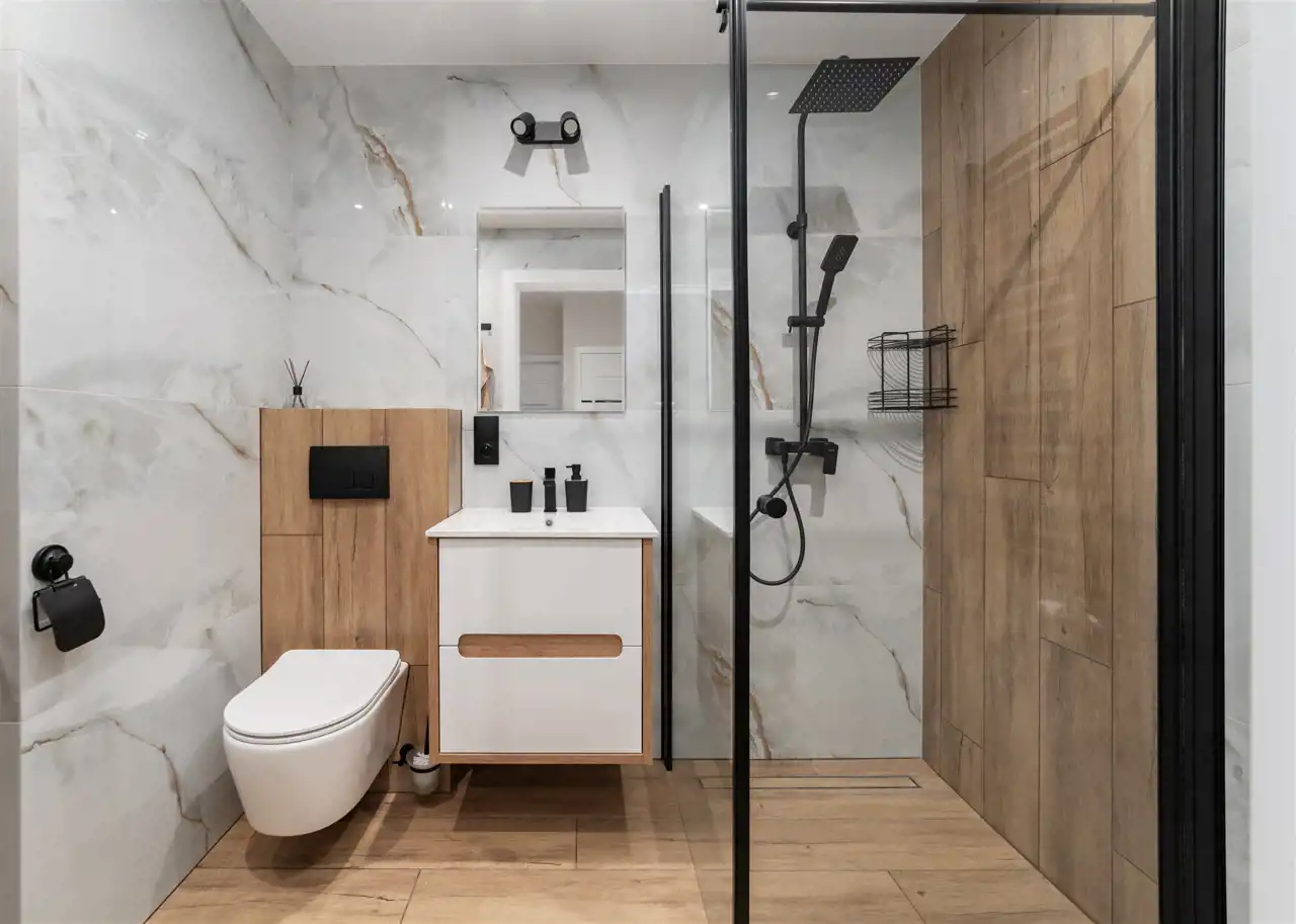 - nowoczesną łazienkę z WC wyposażoną w duży natrysk i umywalkę;