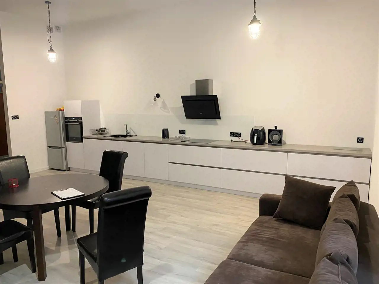 - ANEKS KUCHENNY: z długim blatem przez całą ścianę, kuchnia kompletnie wyposażona: płyta indukcyjna, lodówka z zamrażarką, zmywarka, piekarnik, zlewozmywak z pochłaniaczem,