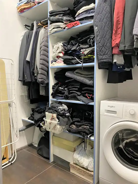 - GARDEROBA: wbudowane regały - zabudowana cała ściana aż do sufitu, drabinka, pralka, deska do prasowania, suszarka rozkładana,