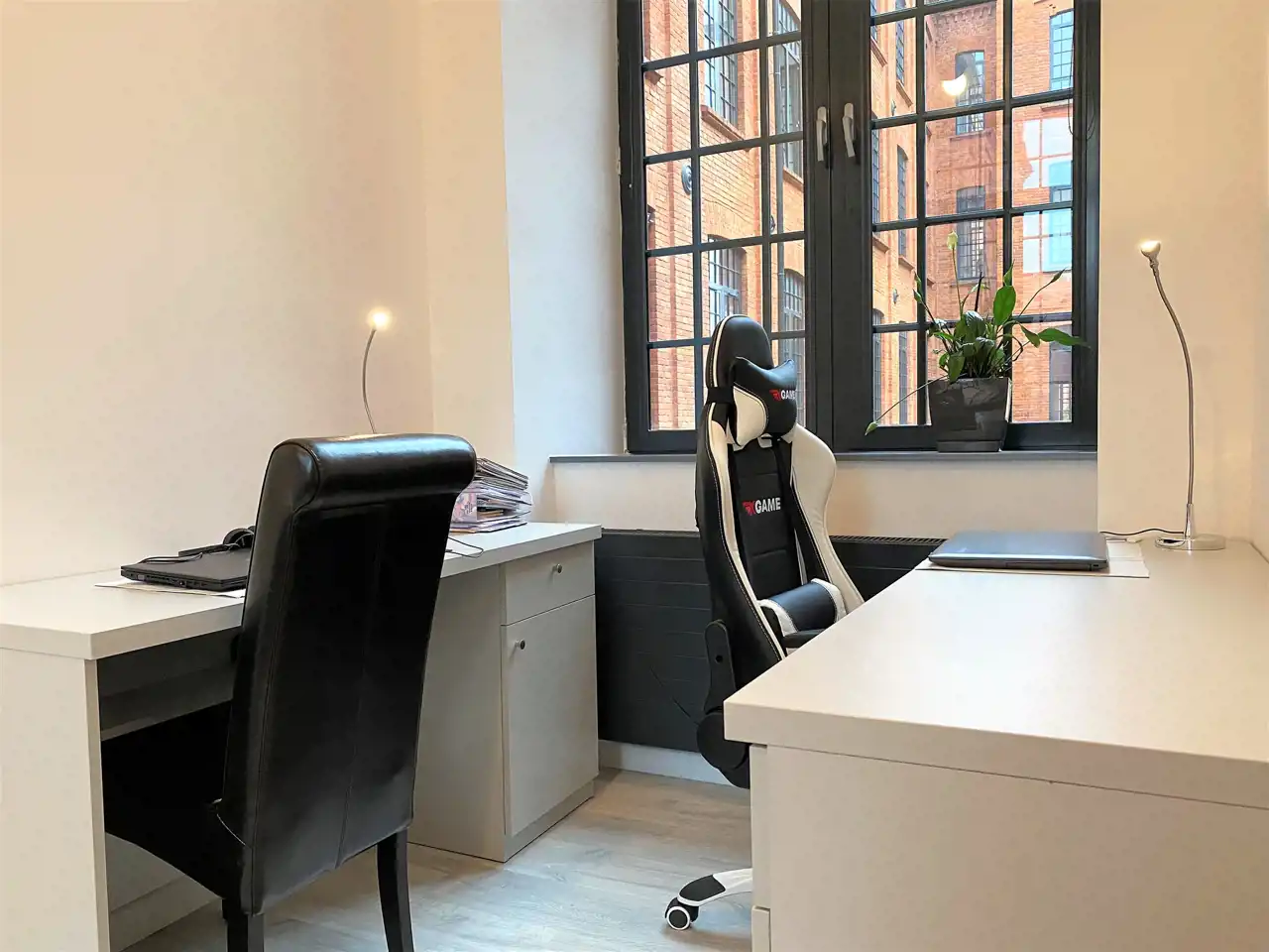 - SYPIALNIA Z CZĘŚCIĄ GABINETOWĄ: z dwoma dużymi oknami typu witryna od strony wschodniej i zachodniej, od strony wschodniej kącik gabinetowy (do pracy) z dwoma biurkami i krzesłami (jednio na kółkach), od strony zachodniej kącik sypialniany z łóżkiem podwójnym i z 2 lampkami nocnymi,