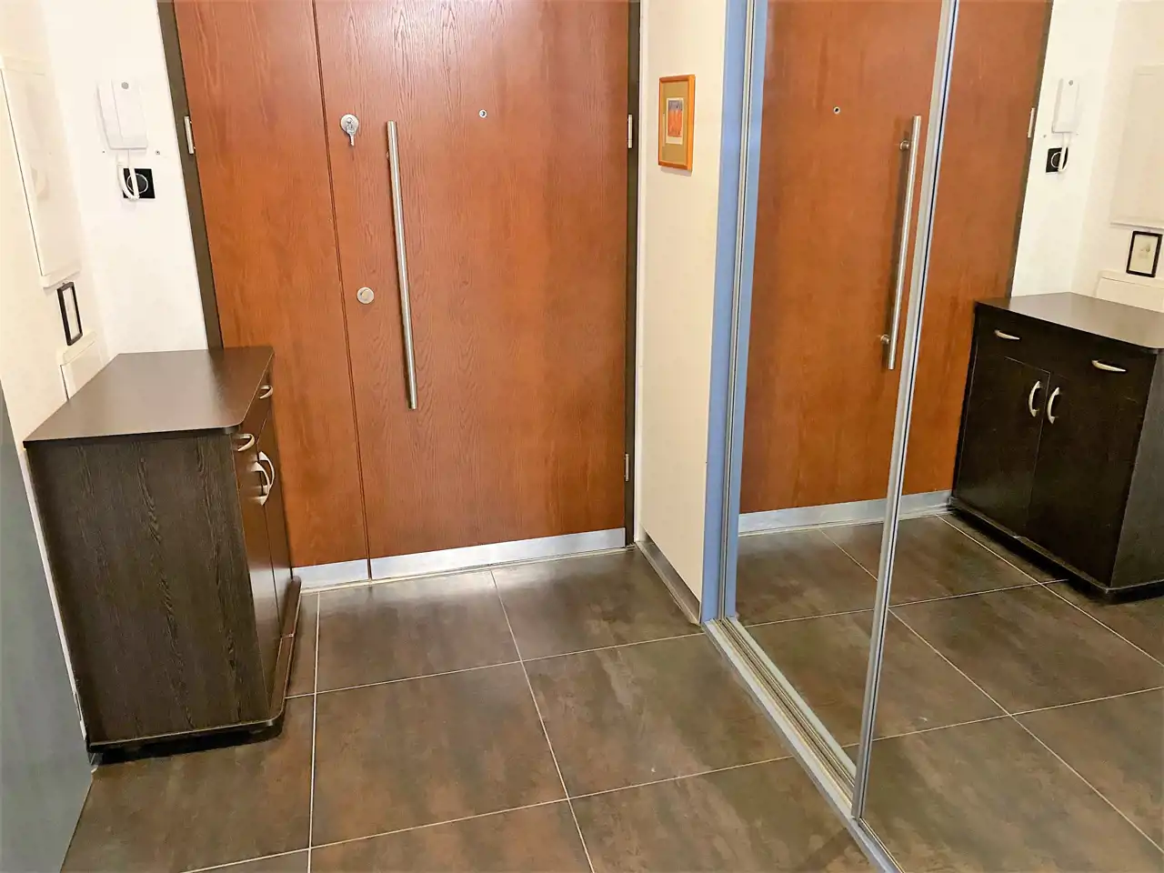 - HOL WEJŚCIOWY: z niego wejście przez drzwi przesuwne z lustrem do garderoby oraz wejście do łazienki z wc po drugiej stronie holu, w holu szafka na buty,