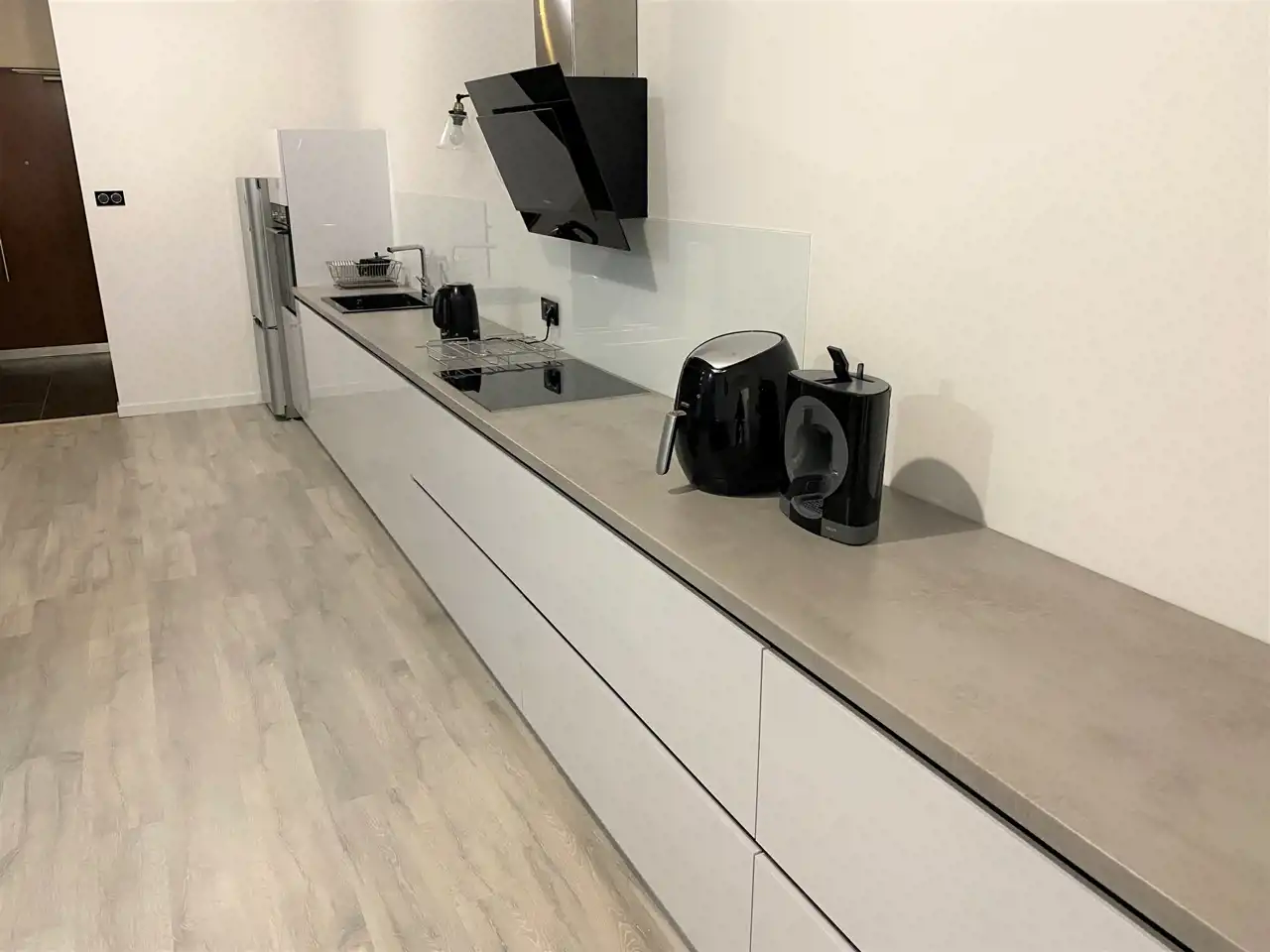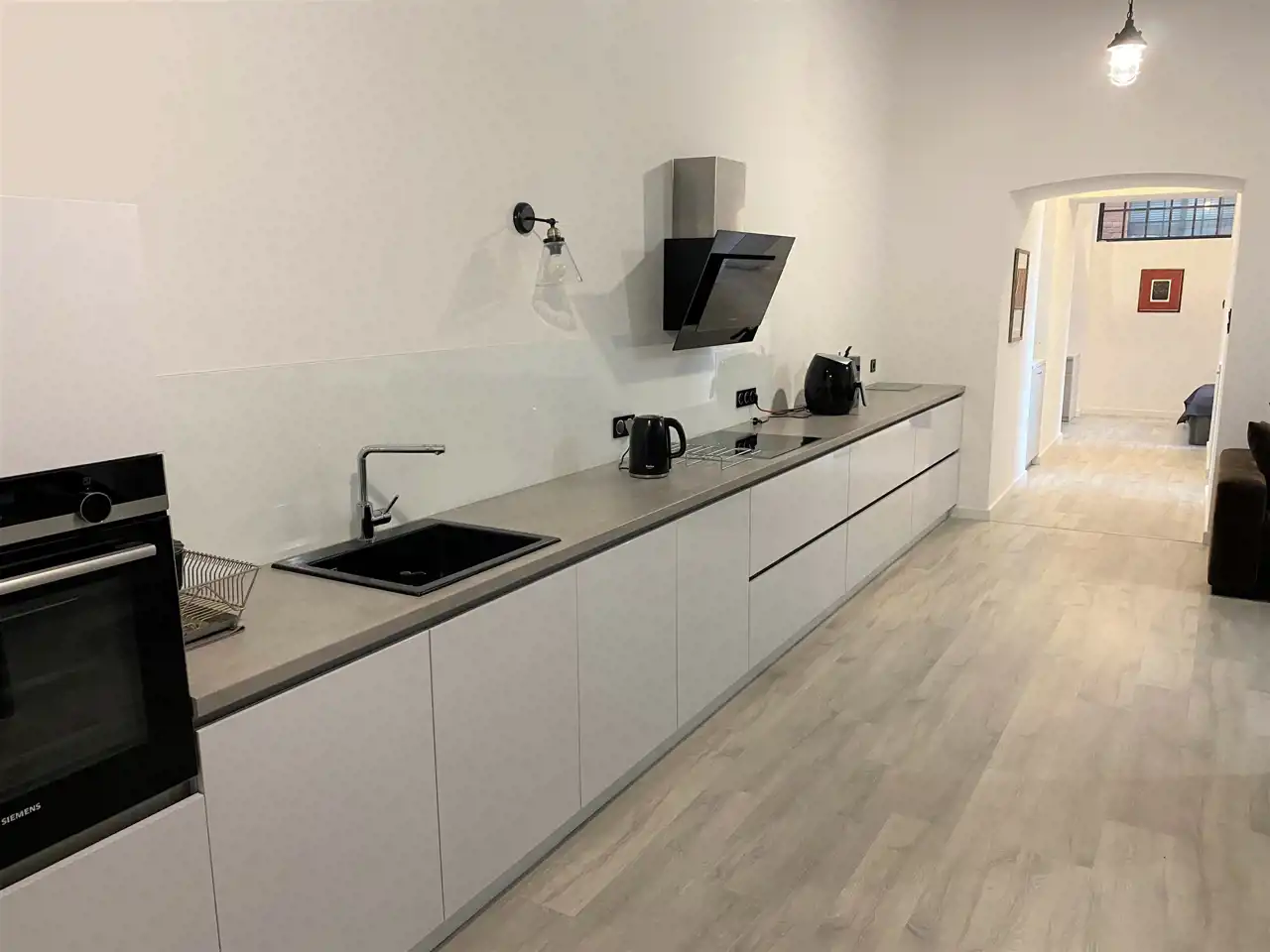 - ANEKS KUCHENNY: z długim blatem przez całą ścianę, kuchnia kompletnie wyposażona: płyta indukcyjna, lodówka z zamrażarką, zmywarka, piekarnik, zlewozmywak z pochłaniaczem,