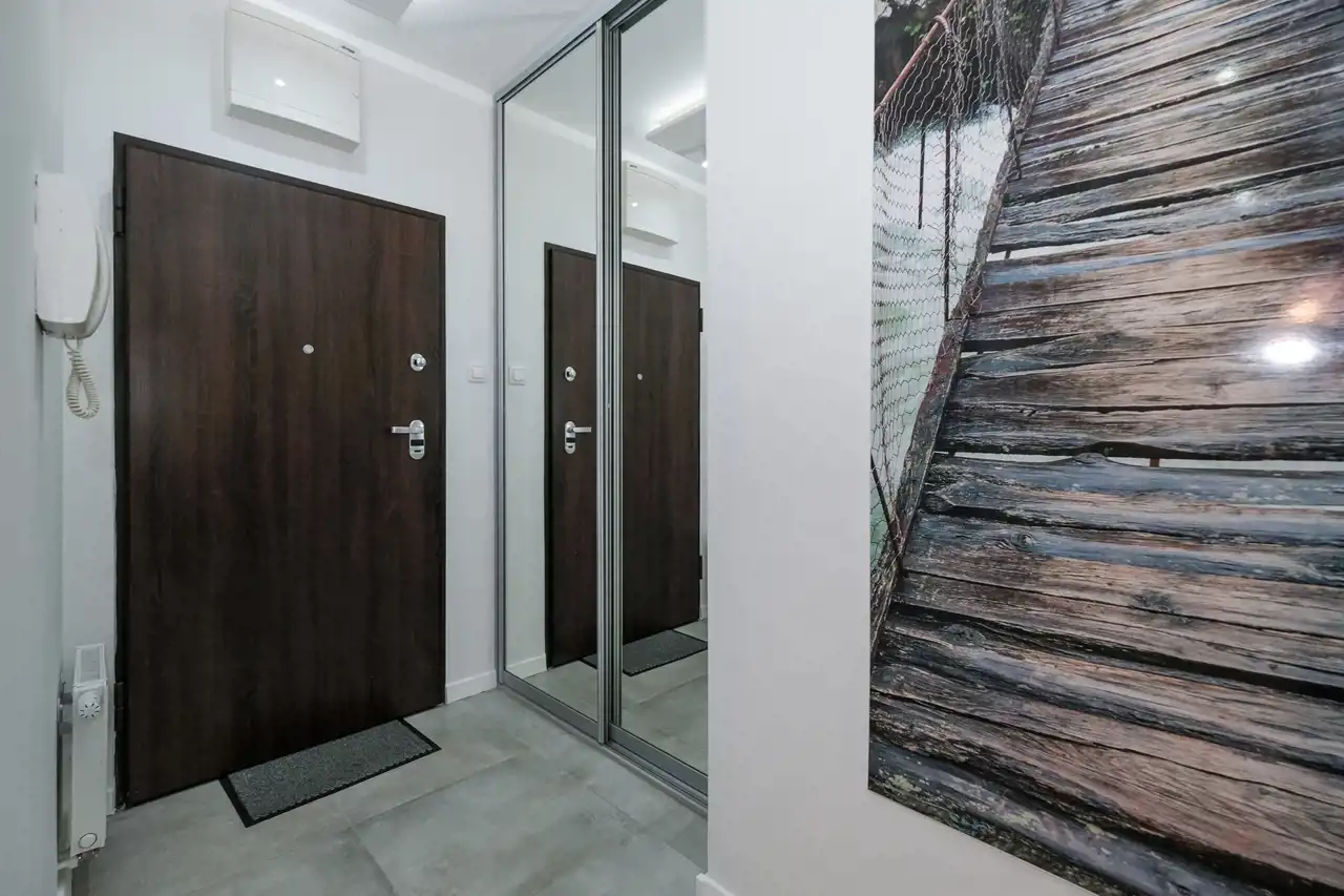 Prezentowane mieszkanie składa się z: salonu, wyposażonego w wygodną kanapę, połączonego z aneksem kuchennym (kuchnia w pełni wyposażona m.in. w zmywarkę, lodówkę, płytę indukcyjną, piekarnik), sypialni z podwójnym łóżkiem i pojemną szafą. Dodatkowo salon posiada wyjście na balkon z widokiem na miasto.