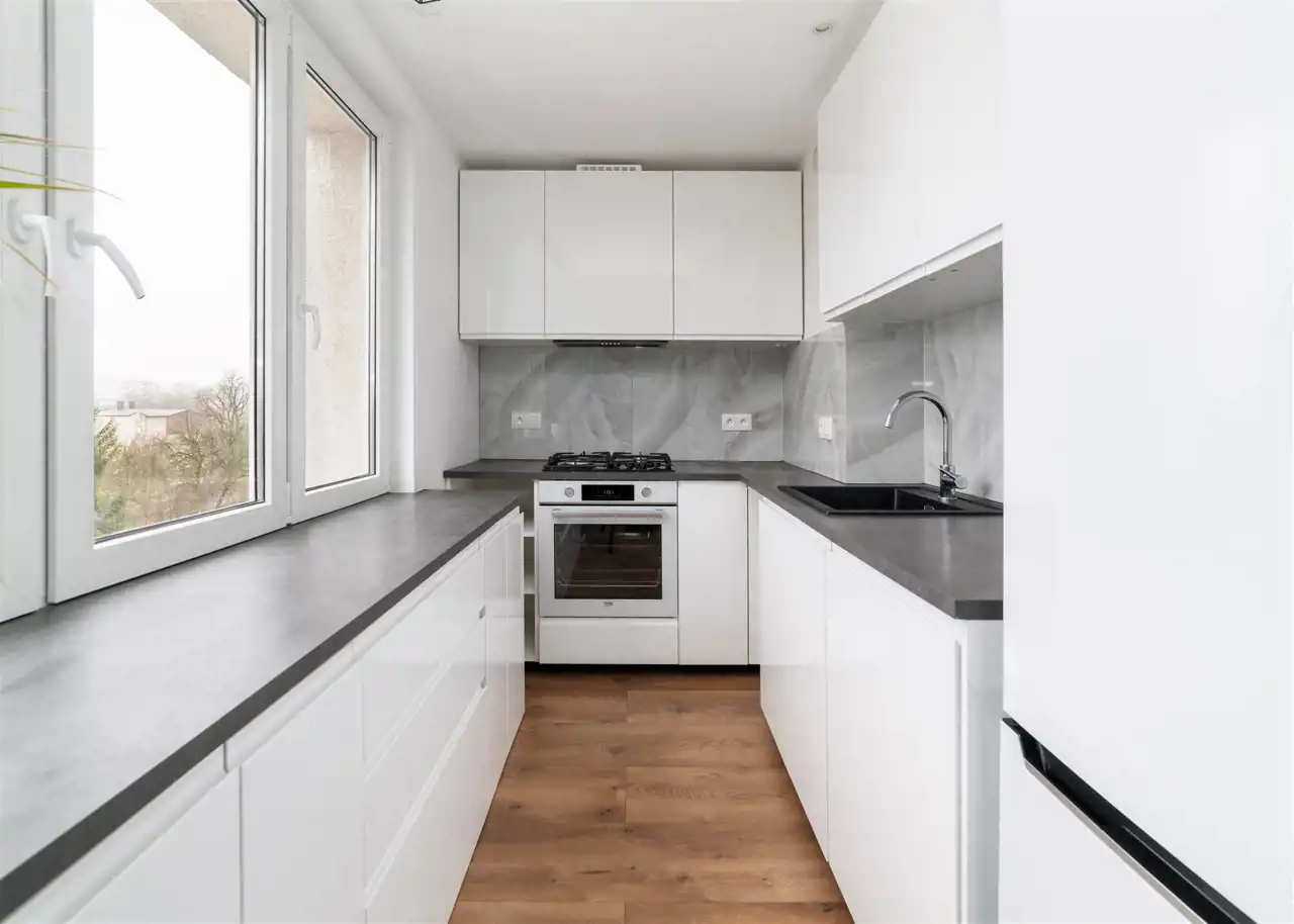 - kuchnię wyposażoną w płytę gazową, piekarnik, okap, zmywarkę i lodówko-zamrażarkę;