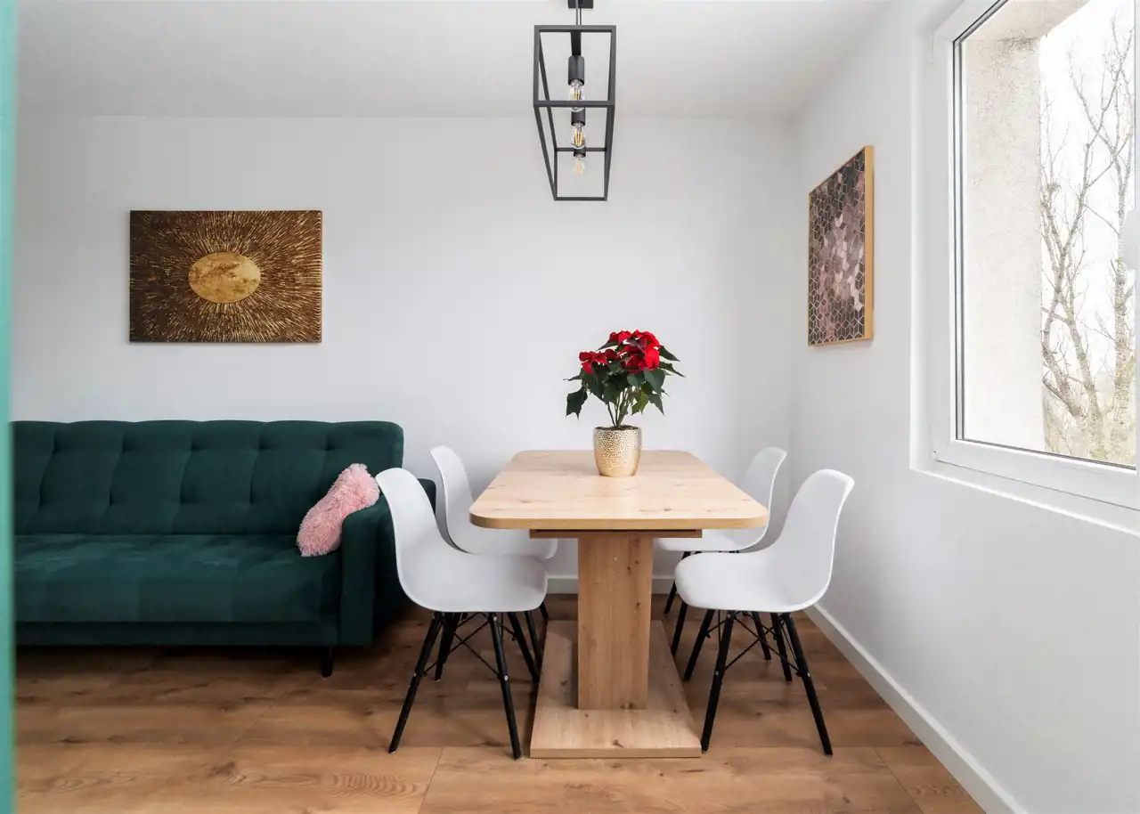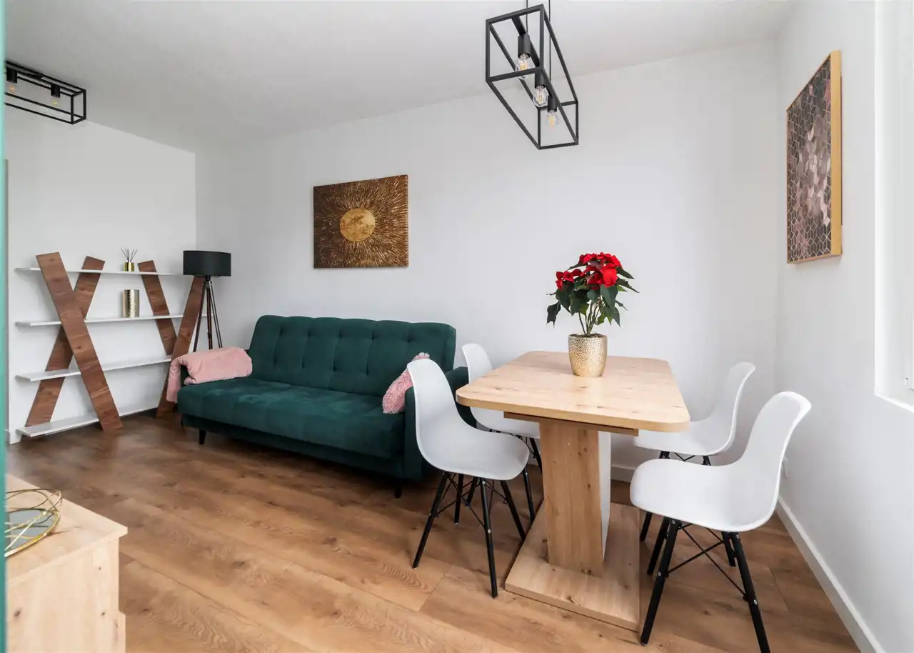 - przestronny salon wyposażony w sofę, stół z 4 krzesłami, regał i szafkę RTV;