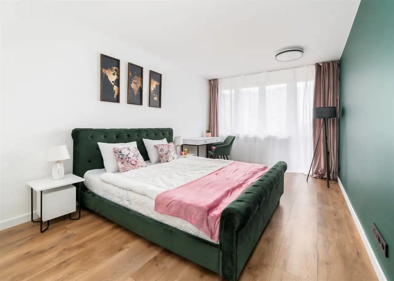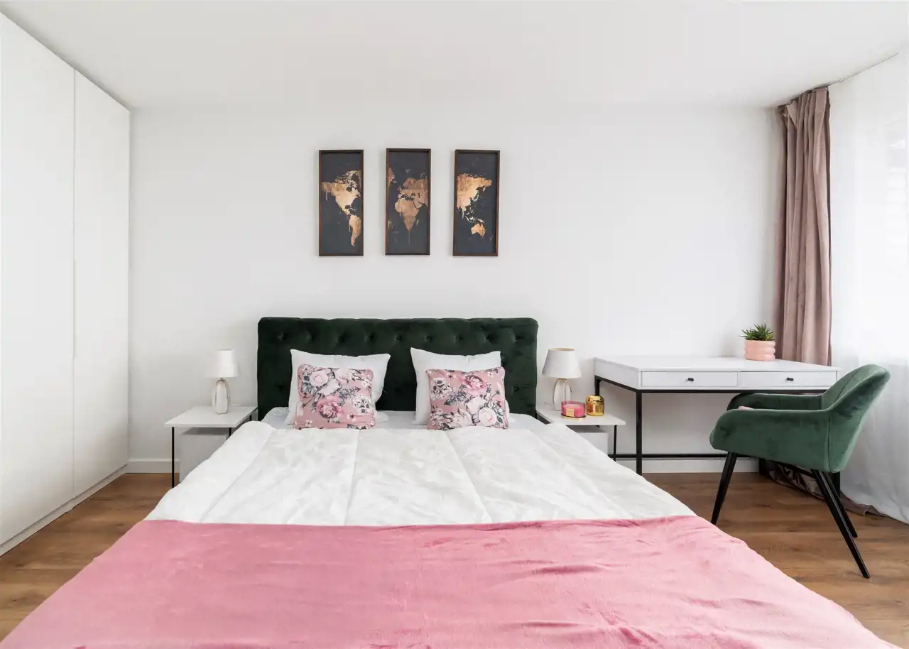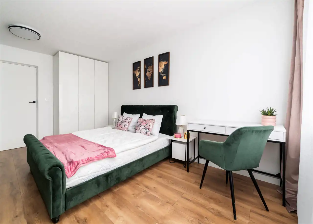 - sypialnię z dużym łóżkiem, dwoma stolikami nocnymi, toaletką, krzesłem i pojemną szafą;