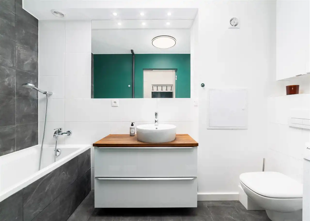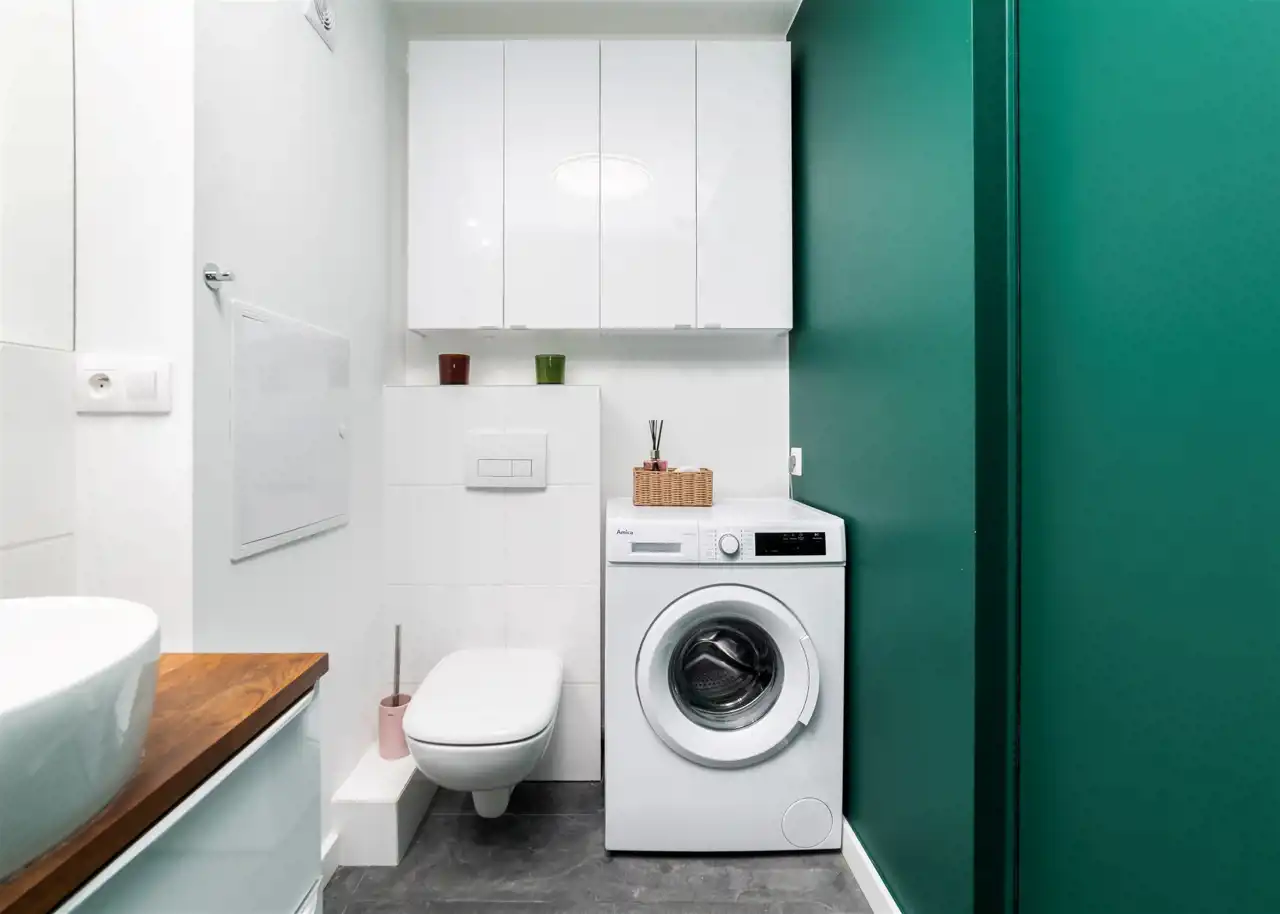 - łazienkę z WC wyposażoną w wannę z funkcją prysznica, umywalkę i pralkę;