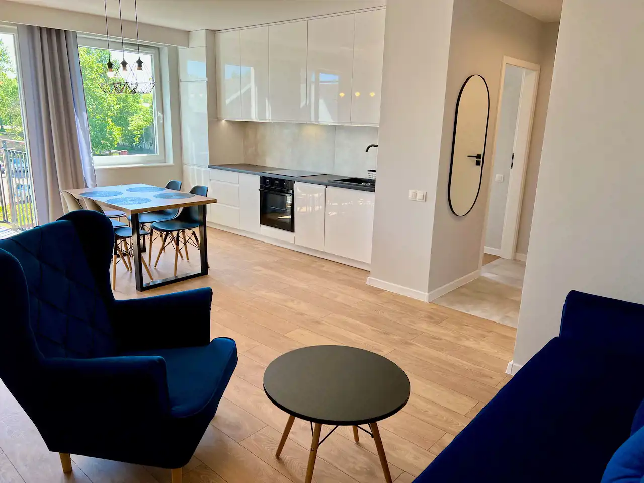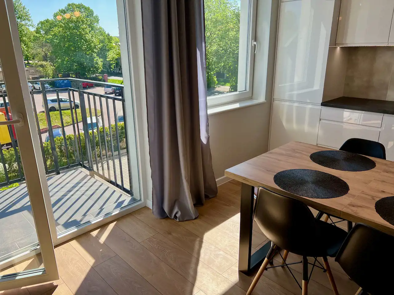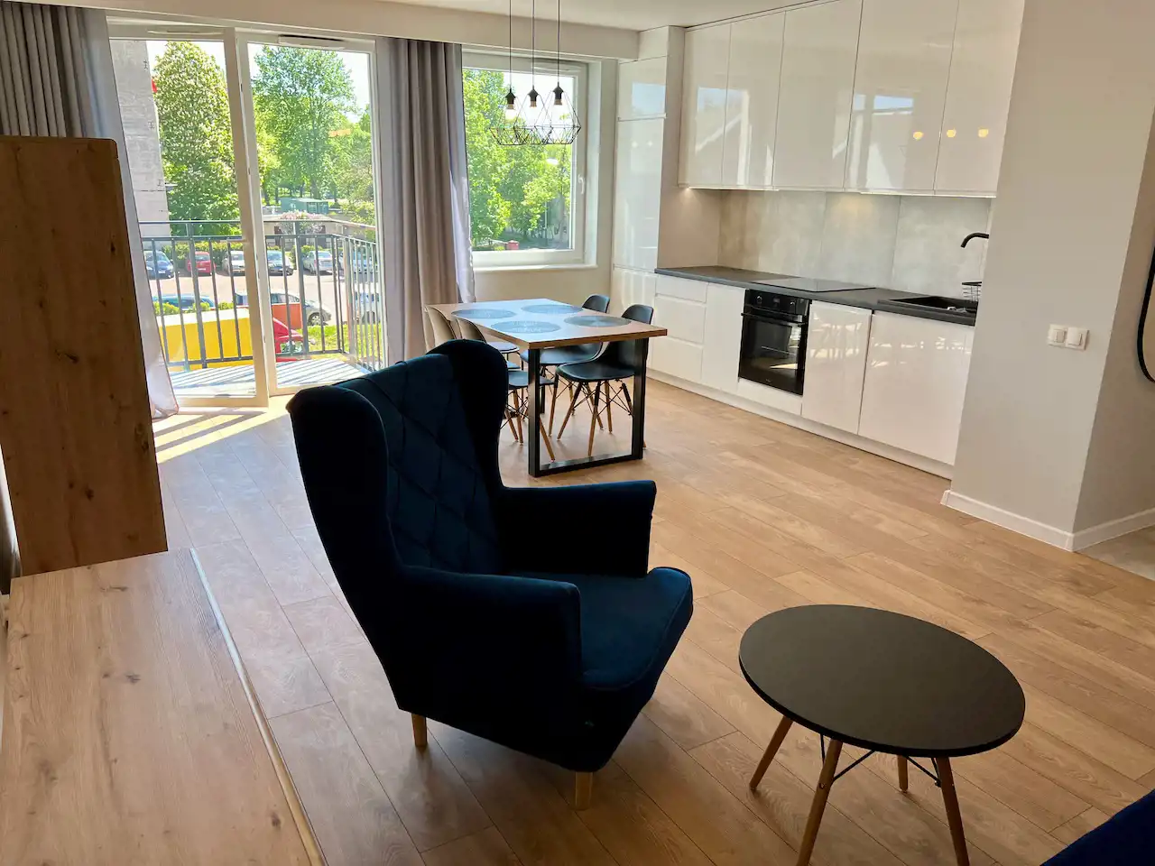 Lokal jest całkowicie umeblowany i wyposażony. Wszystko jest nowoczesne i nowe. Jest tutaj pokój dzienny z aneksem kuchennym i wyjściem na balkon, sypialnia, łazienka i hol. W salonie rozkładana kanapa, fotel, komoda, stół z krzesłami, niski stolik kawowy i szafka telewizyjna. W kuchni meble pod wymiar i sprzęt AGD w zabudowie (lodówko-zamrażarka, piekarnik, zmywarka, wyciąg i płyta indukcyjna). Łazienka z nowoczesną aranżacją z kabiną prysznicową, pralką, umywalką i podwieszaną muszlą WC. W holu szafa wnękowa, szafka na buty, wieszak i lustro. Teren zamknięty z bramą wjazdową na pilota, cyfrowy domofon. Winda z poziomu garażu. Media miejskie. Przypisane miejsce postojowe w garażu wielostanowiskowym pod budynkiem.