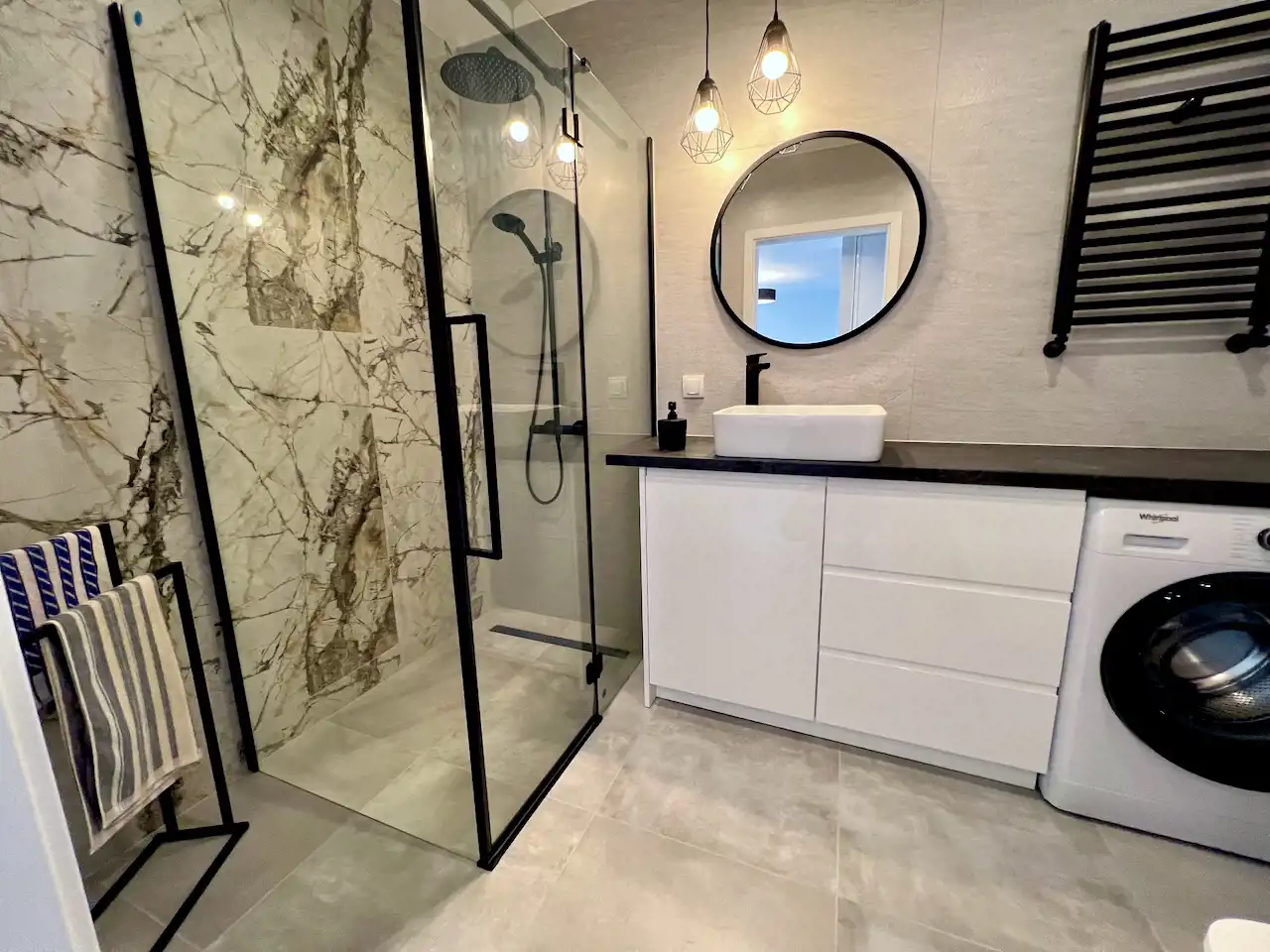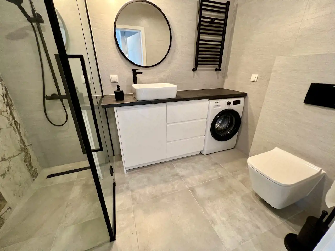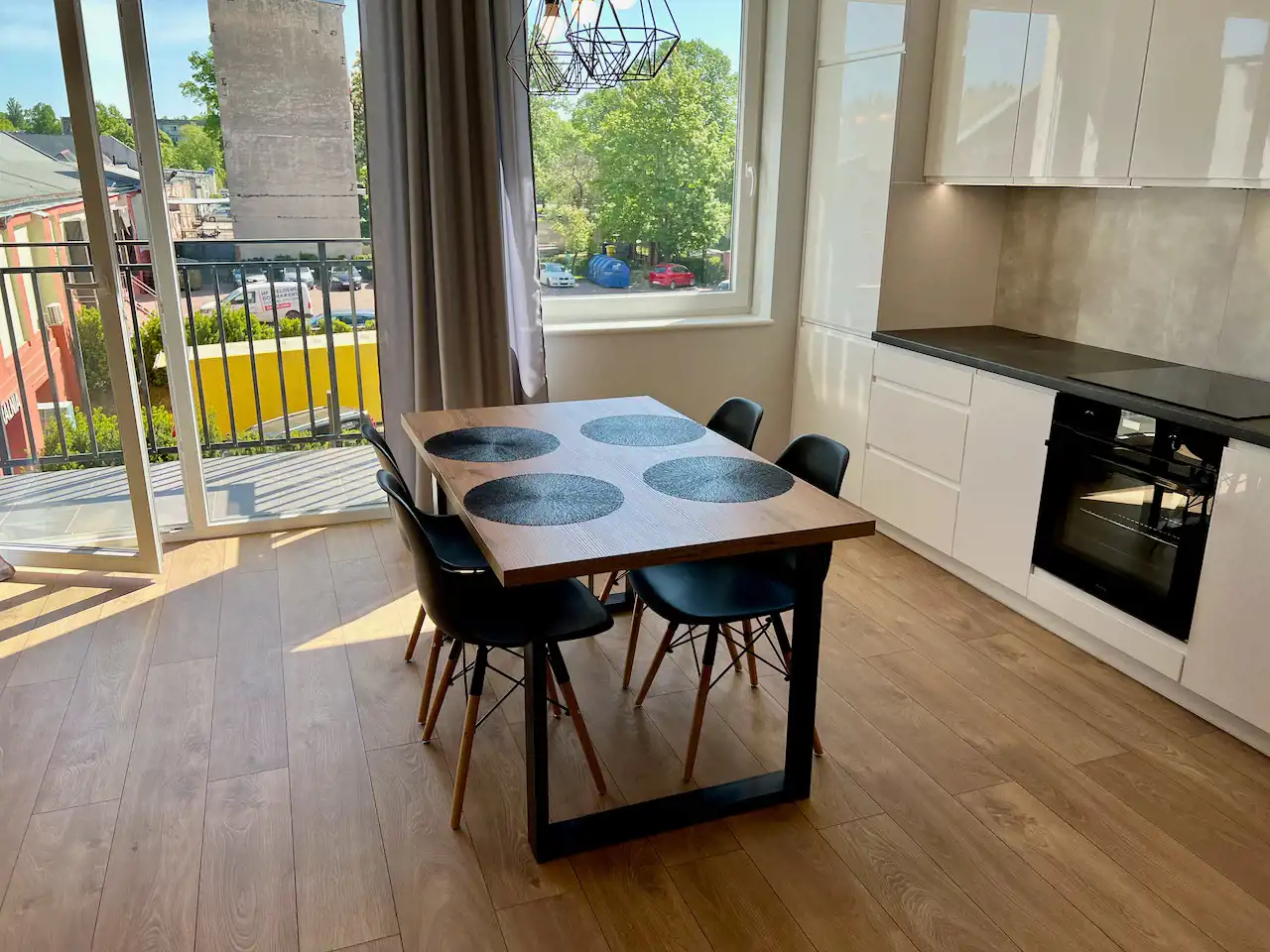 Lokal jest całkowicie umeblowany i wyposażony. Wszystko jest nowoczesne i nowe. Jest tutaj pokój dzienny z aneksem kuchennym i wyjściem na balkon, sypialnia, łazienka i hol. W salonie rozkładana kanapa, fotel, komoda, stół z krzesłami, niski stolik kawowy i szafka telewizyjna. W kuchni meble pod wymiar i sprzęt AGD w zabudowie (lodówko-zamrażarka, piekarnik, zmywarka, wyciąg i płyta indukcyjna). Łazienka z nowoczesną aranżacją z kabiną prysznicową, pralką, umywalką i podwieszaną muszlą WC. W holu szafa wnękowa, szafka na buty, wieszak i lustro. Teren zamknięty z bramą wjazdową na pilota, cyfrowy domofon. Winda z poziomu garażu. Media miejskie. Przypisane miejsce postojowe w garażu wielostanowiskowym pod budynkiem.
