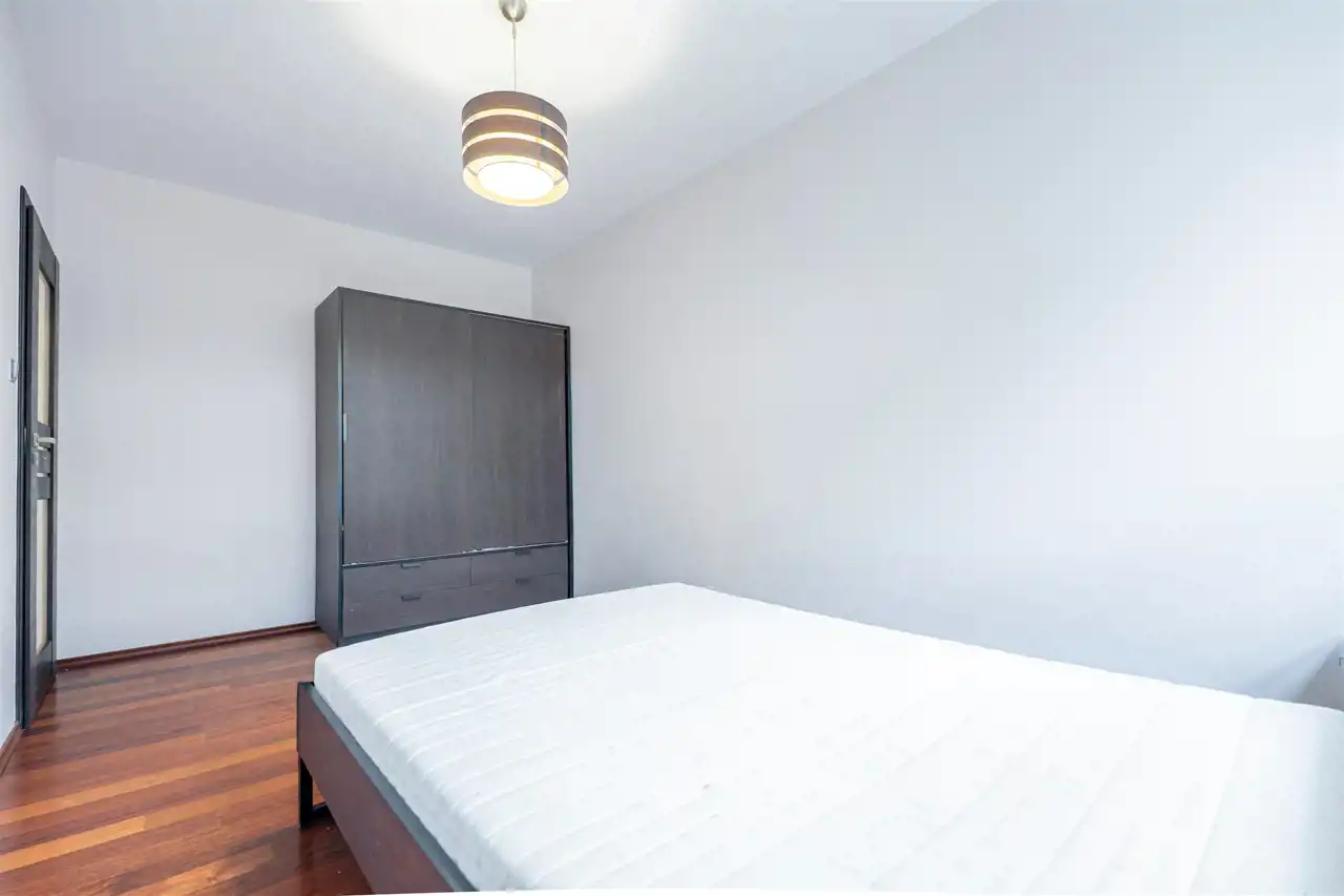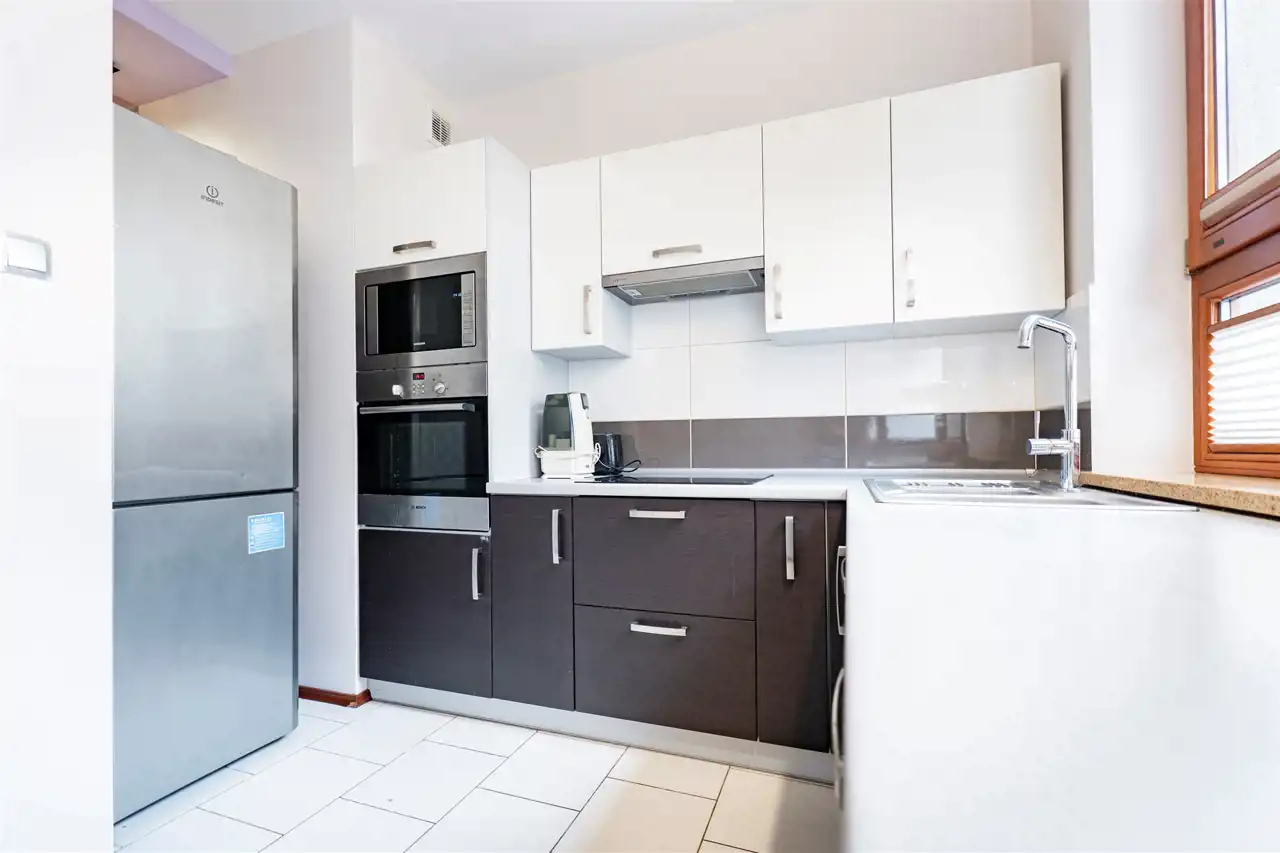 Mieszkanie całkowicie umeblowane - w salonie znajdziemy wygodną kanapę rogową, stolik kawowy, stół z krzesłami, TV. Kuchnia wyposażona we wszystkie niezbędne sprzęty m.in. lodówka, piekarnik, płyta indukcyjna, zmywarka. W sypialni znajdziemy duże, małżeńskie łóżko oraz szafę. Łazienka z prysznicem, pralką, WC i umywalką. Dodatkowo w przedpokoju miejsce znalazła szafa w zabudowie.