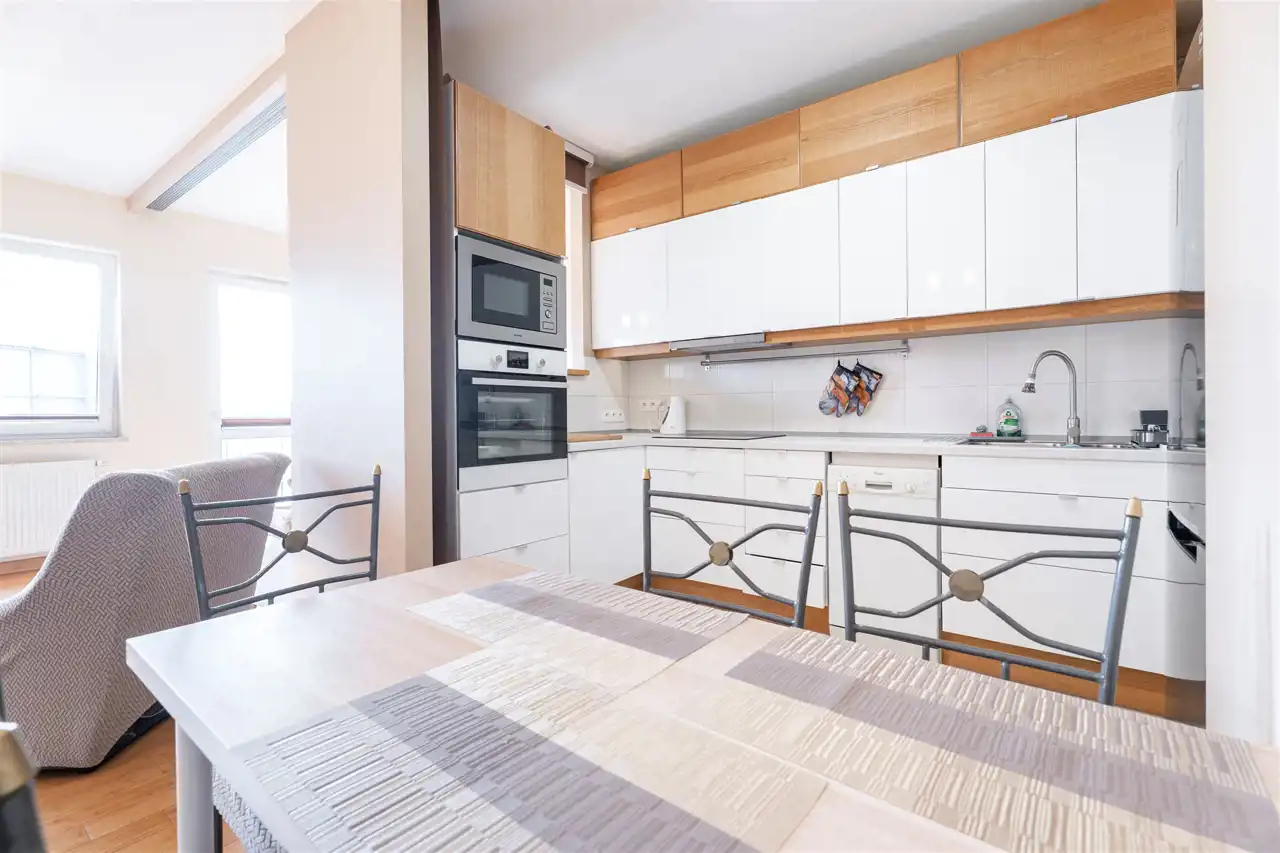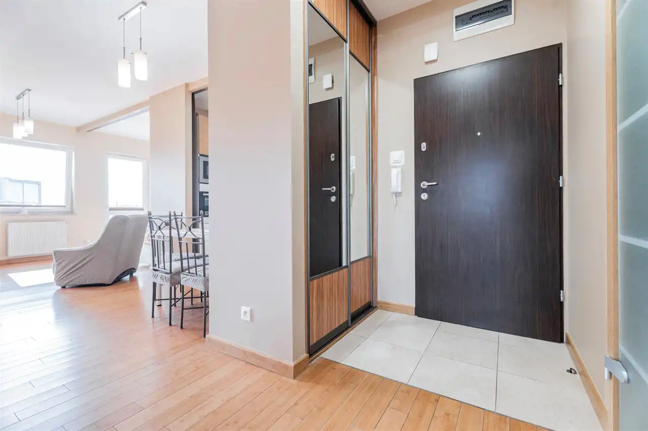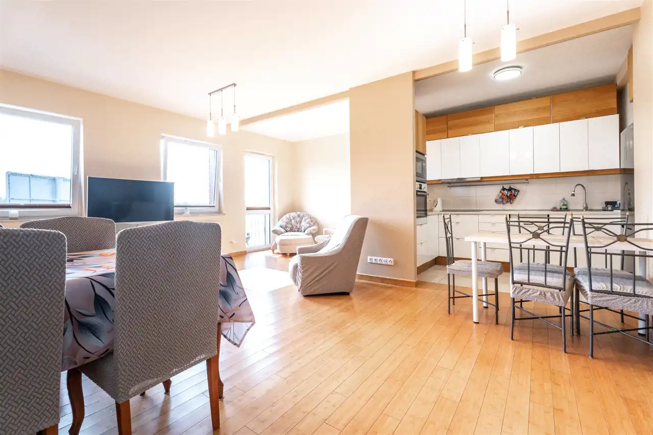 W pełni wyposażone. W salonie kanapa, stół z krzesłami, komoda, regał, stolik kawowy, szafka RTV oraz telewizor. Przy salonie aneks kuchenny, wyposażony w niezbędne sprzęty tj. piekarnik, lodówko-zamrażarkę, zmywarkę, płytę indukcyjna i okap oraz w funkcjonalne meble kuchenne i podstawowy komplet naczyń i sztućców. Sypialnia posiada rozkładaną sofę, dużą przestronną szafę w zabudowie oraz szafki nocne. W łazience prysznic, umywalka z lustrem oraz pralka. W przedpokoju dodatkowa szafa, na wyposażeniu również odkurzacz. Mieszkanie świeżo malowane, wykończone w ciepłym i przytulnym stylu. Drewniana podłoga (bambus).