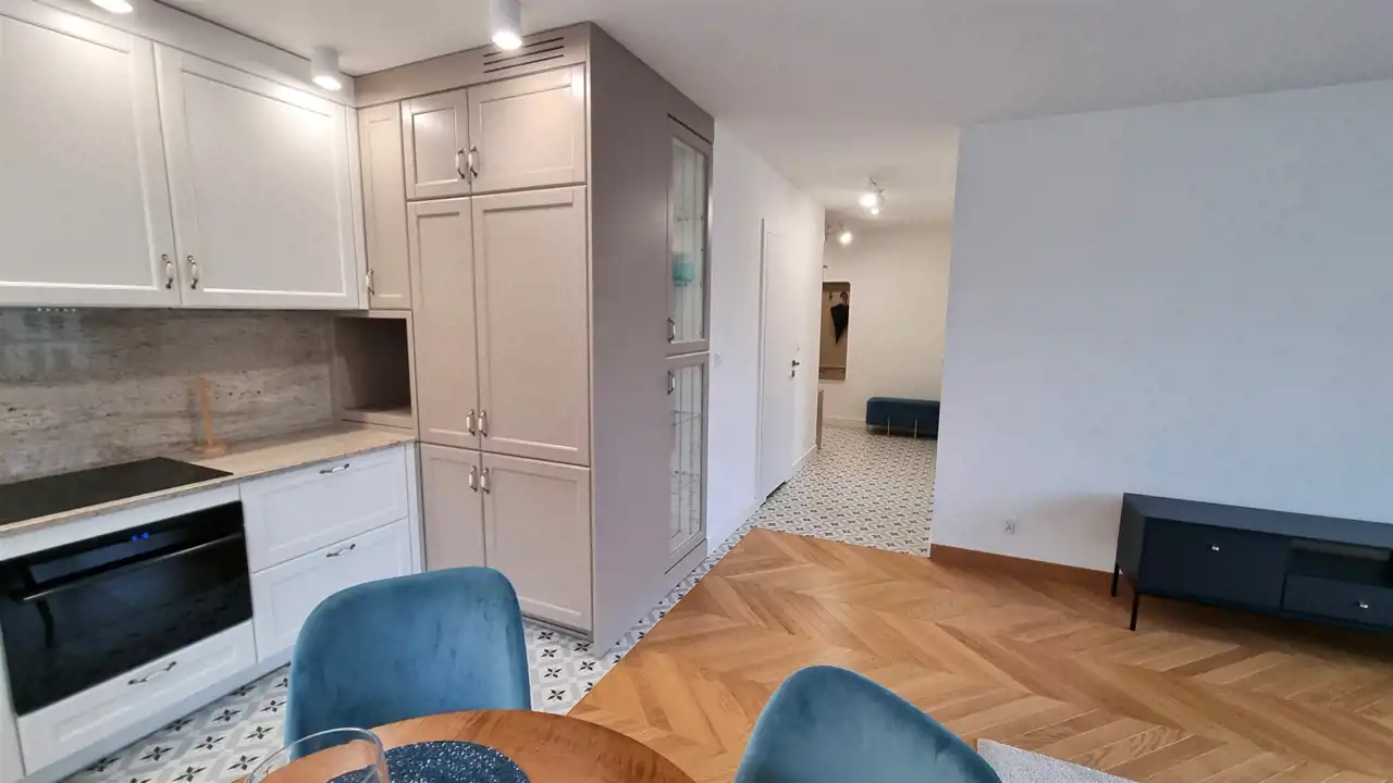 - ANEKS KUCHENNY: meble kuchenne w zabudowie, płyta indukcyjna, piekarnik, lodówka, zmywarka, okap kuchenny, czajnik elektryczny.