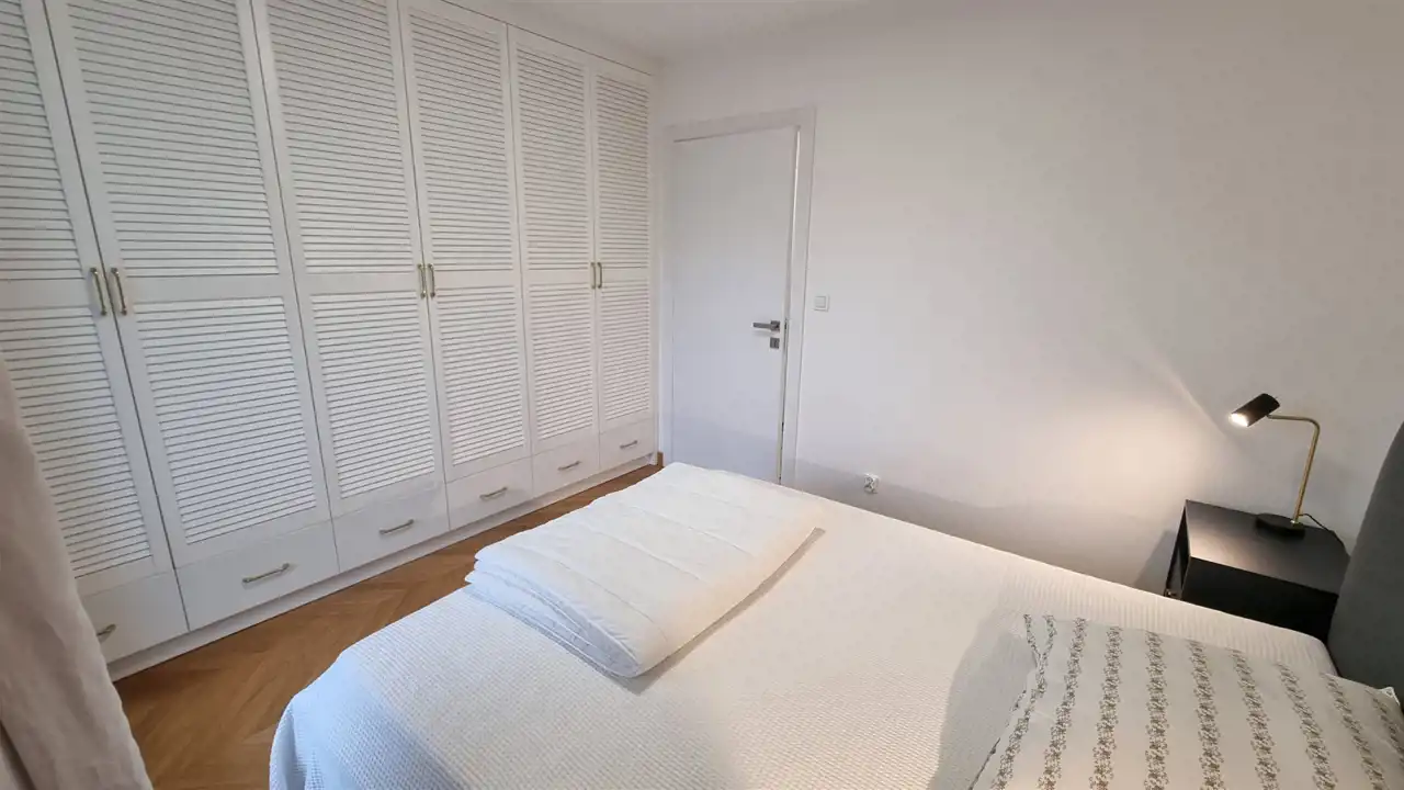 - SYPIALNIA: łóżko podwójne z materacem, szafki nocne, duża szafa w zabudowie.
