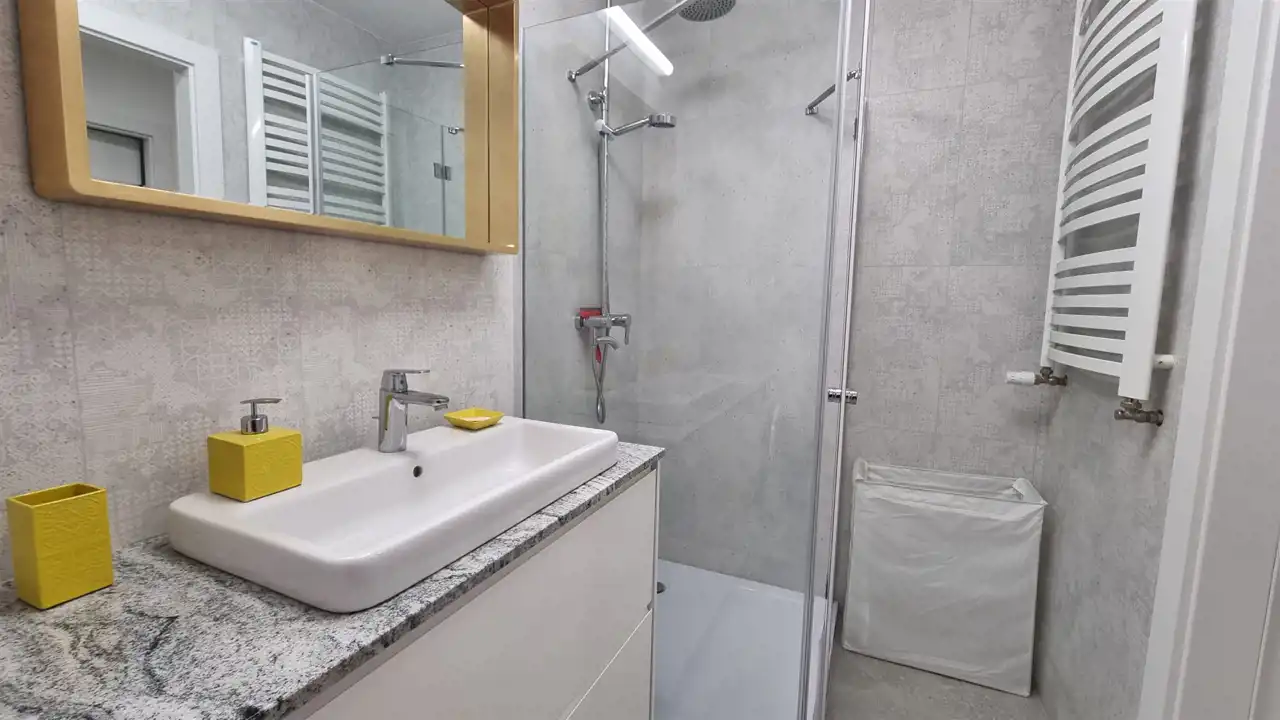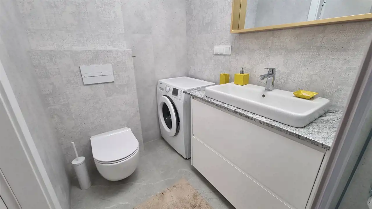 - ŁAZIENKA z WC: kabina prysznicowa, pralka, sedes podwieszany, umywalka z szafką, lustro.
