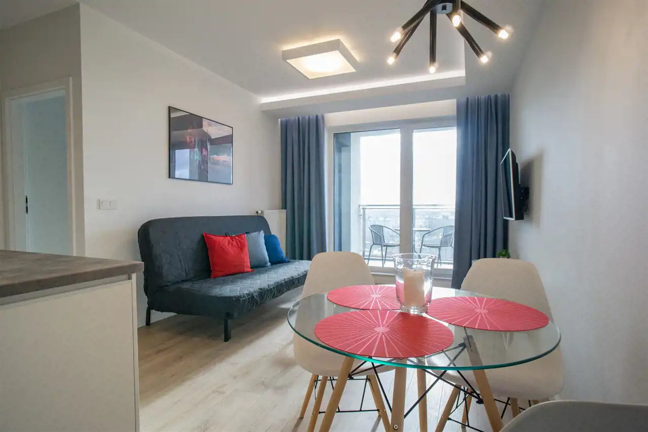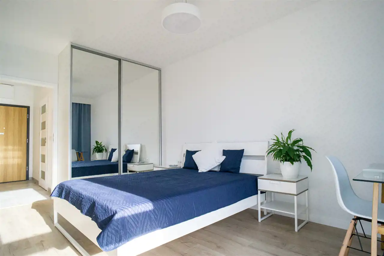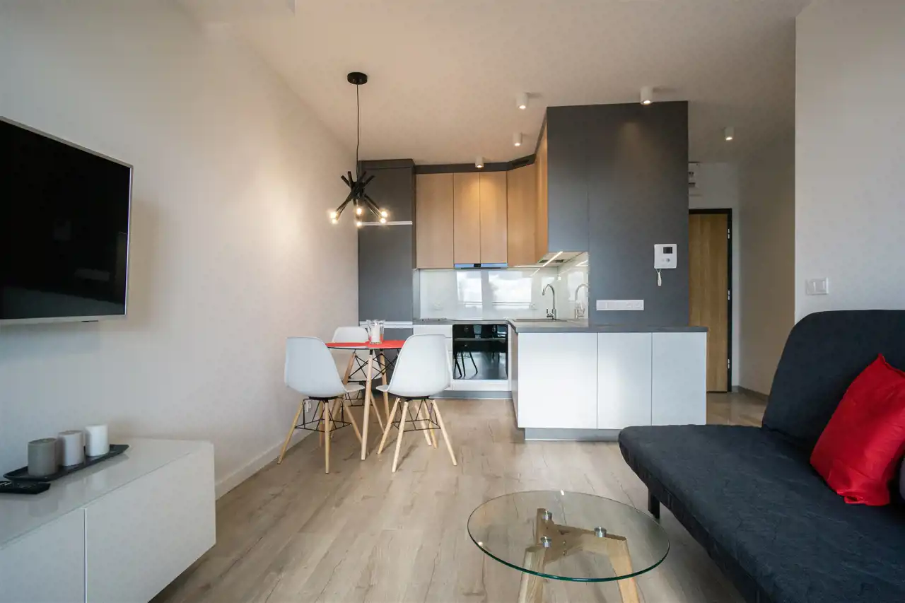Nowocześni i funkcjonalnie urządzone. W salonie znajduje się wygodna kanapa z funkcją spania, stół z krzesłami, szafka RTV, TV, stolik kawowy. Aneks kuchenny w pełni wyposażony we wszystkie niezbędne sprzęty m.in. lodówko-zamrażarka, zmywarka, płyta indukcyjna, piekarnik. W sypialni znajdziemy podwójne łóżko wraz z materacem, pakowną szafę w zabudowie oraz biurko z krzesłem. Łazienka z prysznicem, toaletą, umywalką i pralką. W przedpokoju znalazła swoje miejsce bardzo pakowna szafa w zabudowie.