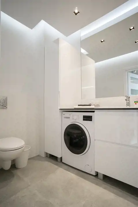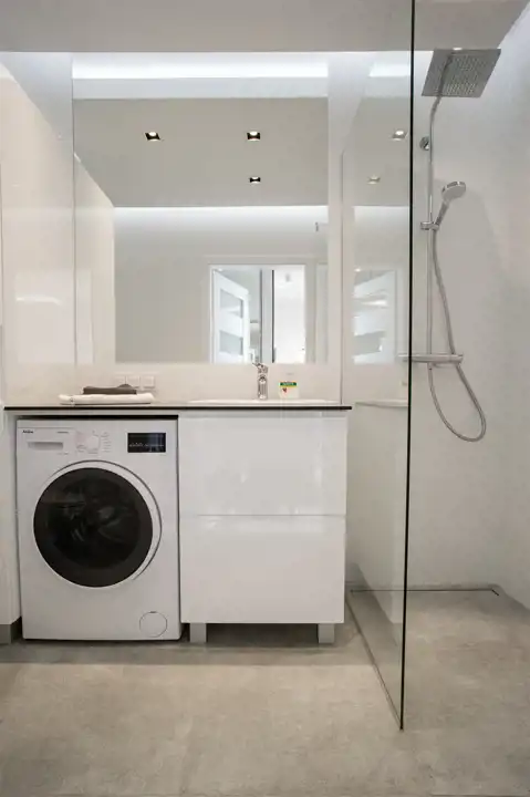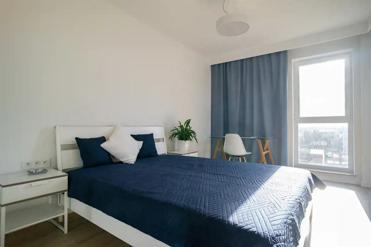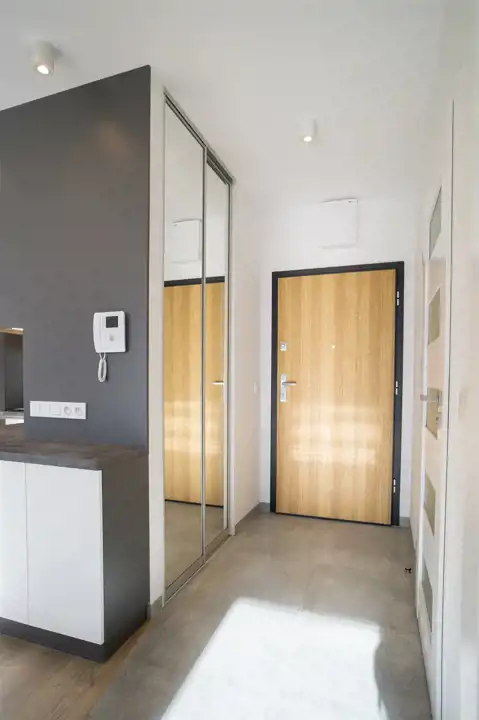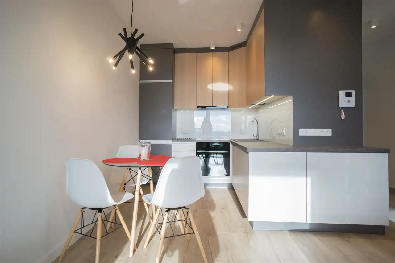 Nowocześni i funkcjonalnie urządzone. W salonie znajduje się wygodna kanapa z funkcją spania, stół z krzesłami, szafka RTV, TV, stolik kawowy. Aneks kuchenny w pełni wyposażony we wszystkie niezbędne sprzęty m.in. lodówko-zamrażarka, zmywarka, płyta indukcyjna, piekarnik. W sypialni znajdziemy podwójne łóżko wraz z materacem, pakowną szafę w zabudowie oraz biurko z krzesłem. Łazienka z prysznicem, toaletą, umywalką i pralką. W przedpokoju znalazła swoje miejsce bardzo pakowna szafa w zabudowie.