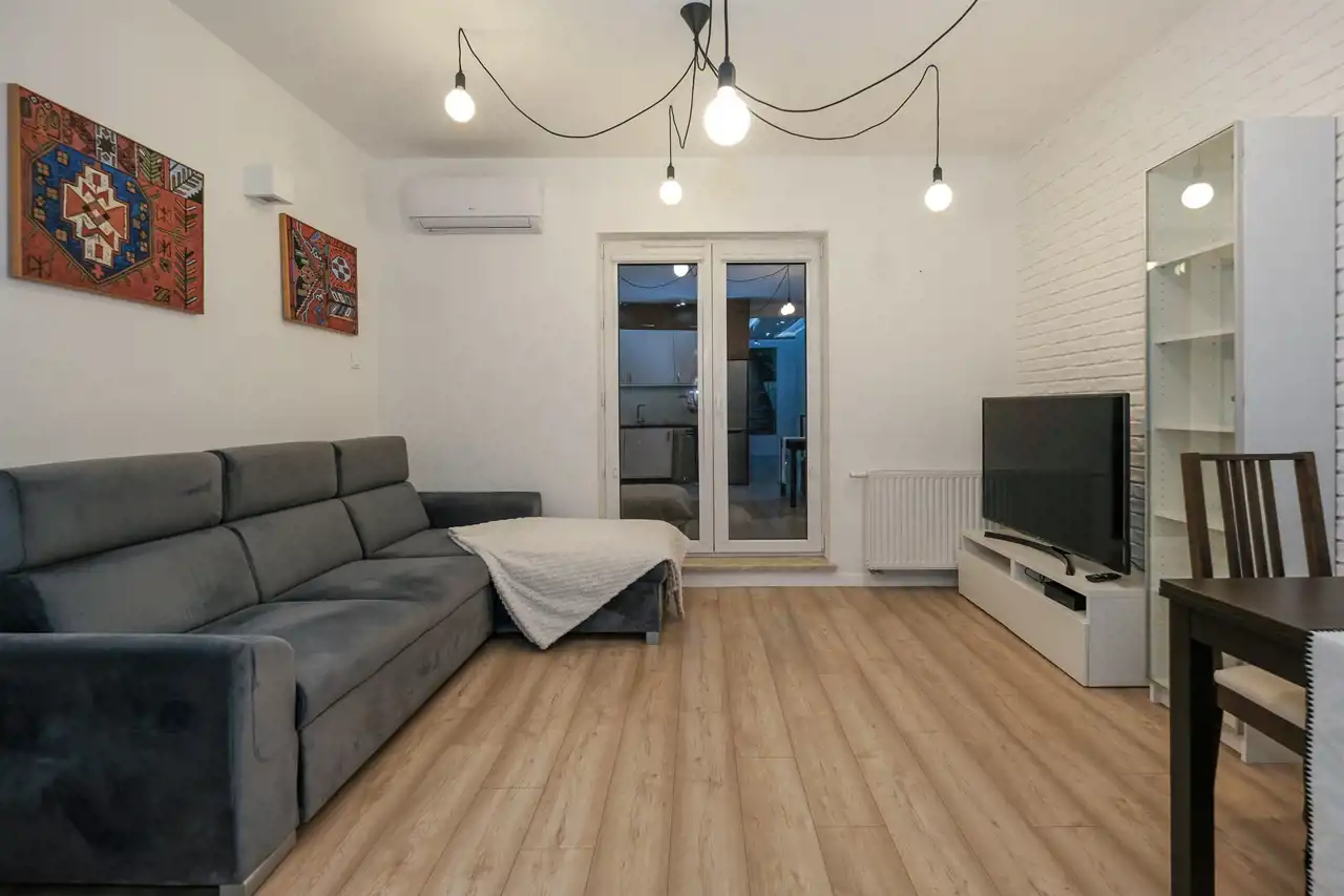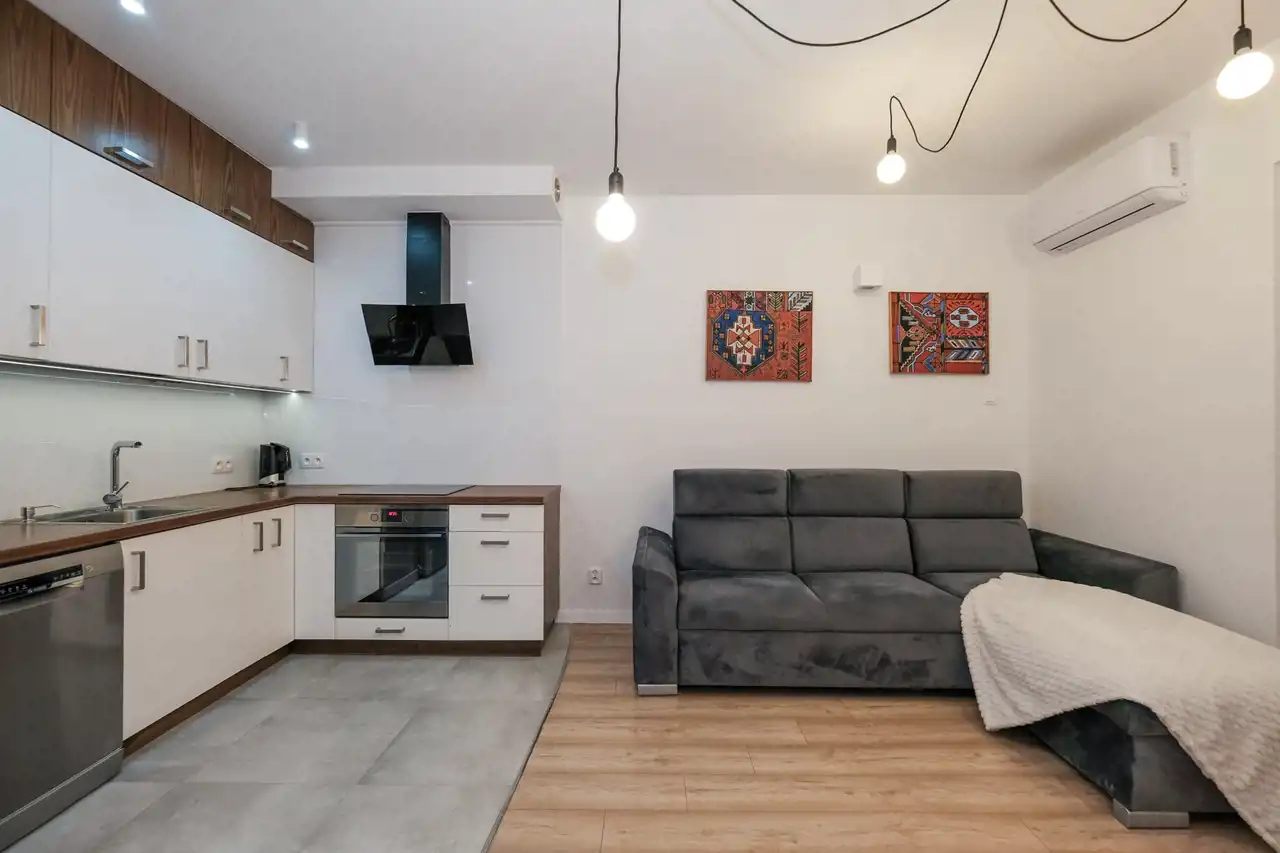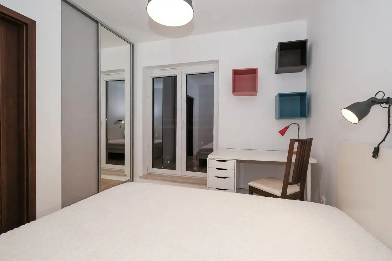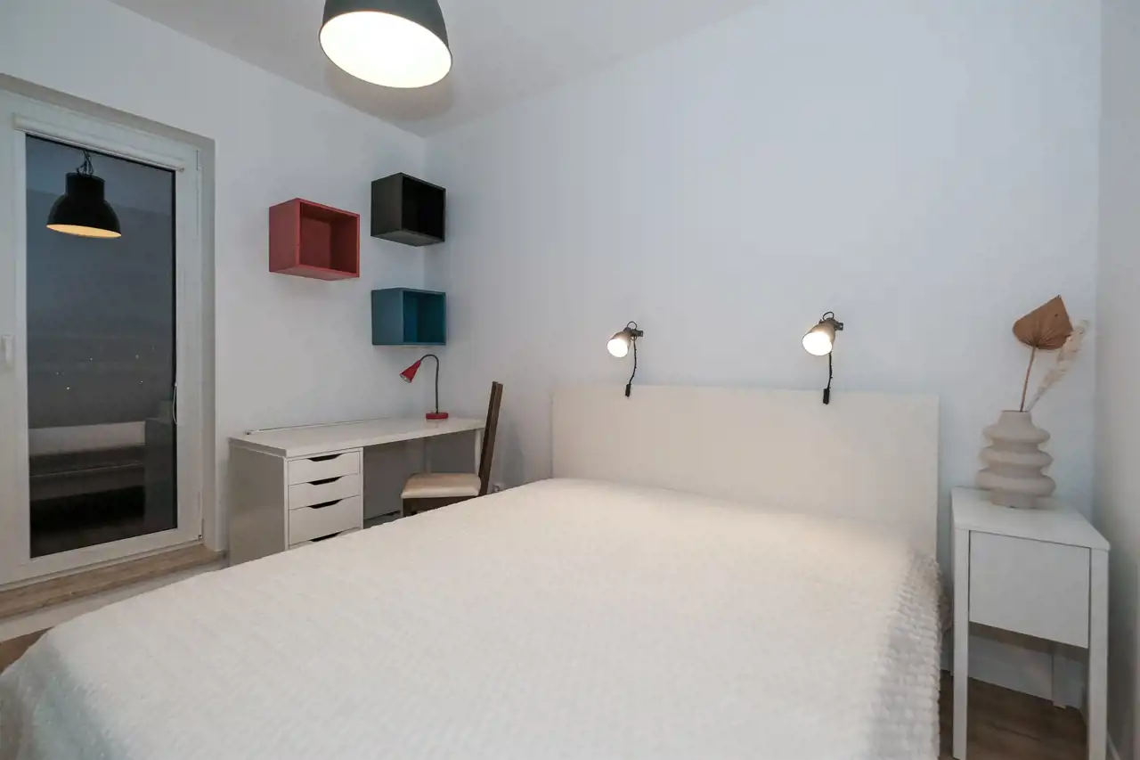 Prezentowane mieszkanie składa się z: salonu, wyposażonego w wygodną kanapę, połączonego z aneksem kuchennym (kuchnia w pełni wyposażona m.in. w zmywarkę, lodówkę, płytę indukcyjną, piekarnik), sypialni z podwójnym łóżkiem i pojemną szafą. Dodatkowo salon posiada wyjście na balkon z widokiem na miasto.