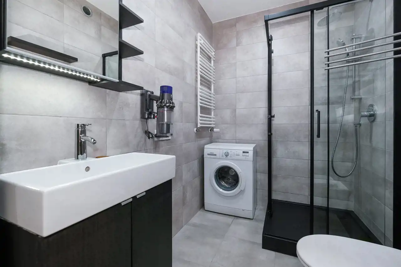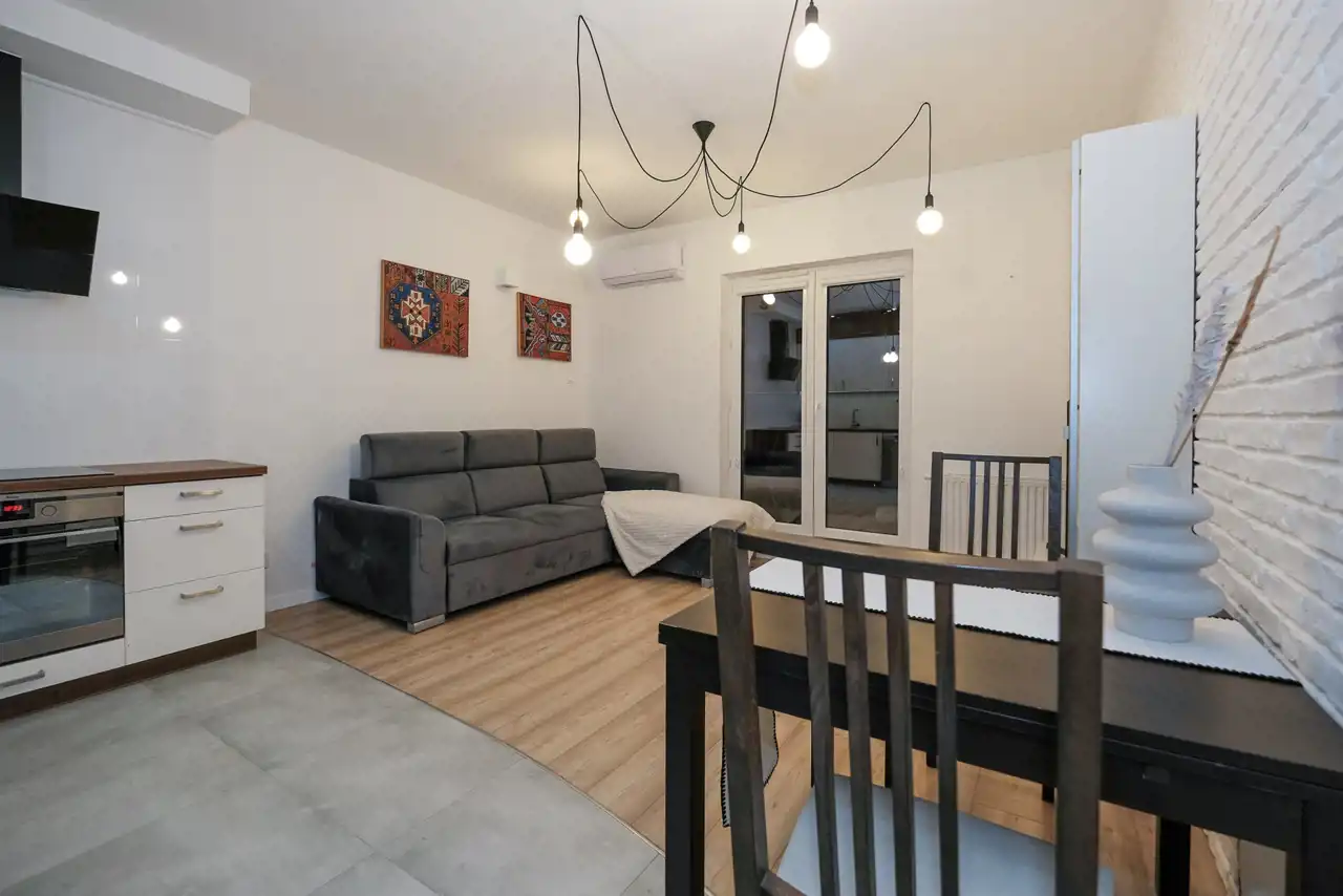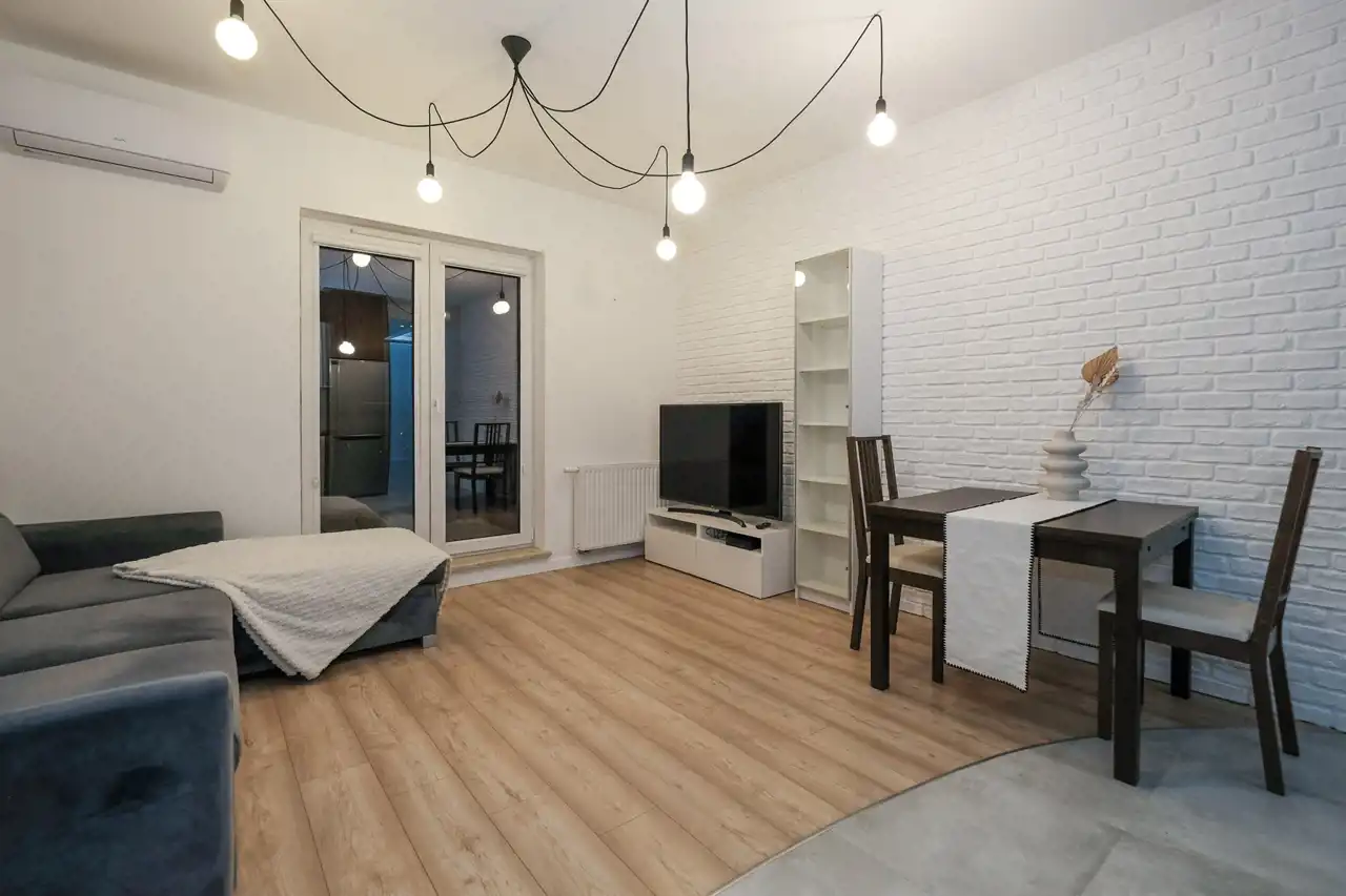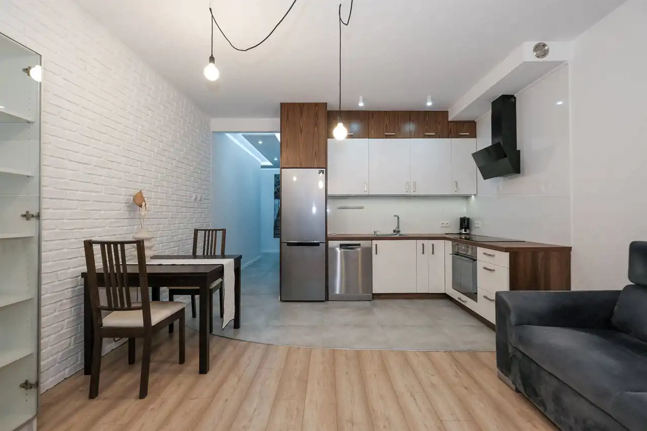 Prezentowane mieszkanie składa się z: salonu, wyposażonego w wygodną kanapę, połączonego z aneksem kuchennym (kuchnia w pełni wyposażona m.in. w zmywarkę, lodówkę, płytę indukcyjną, piekarnik), sypialni z podwójnym łóżkiem i pojemną szafą. Dodatkowo salon posiada wyjście na balkon z widokiem na miasto.