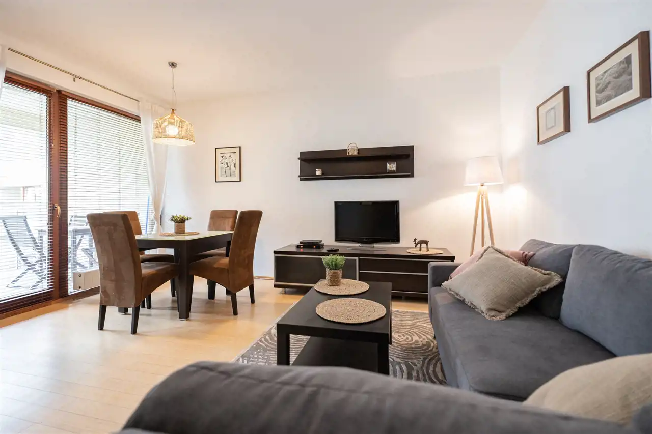 Apartament składa się z przestronnego salonu z bezpośrednim wyjściem na zadaszony taras, dużej sypialni, kuchni we wnęce oraz łazienki.