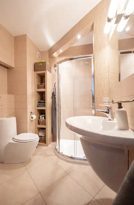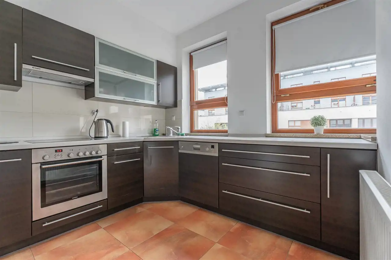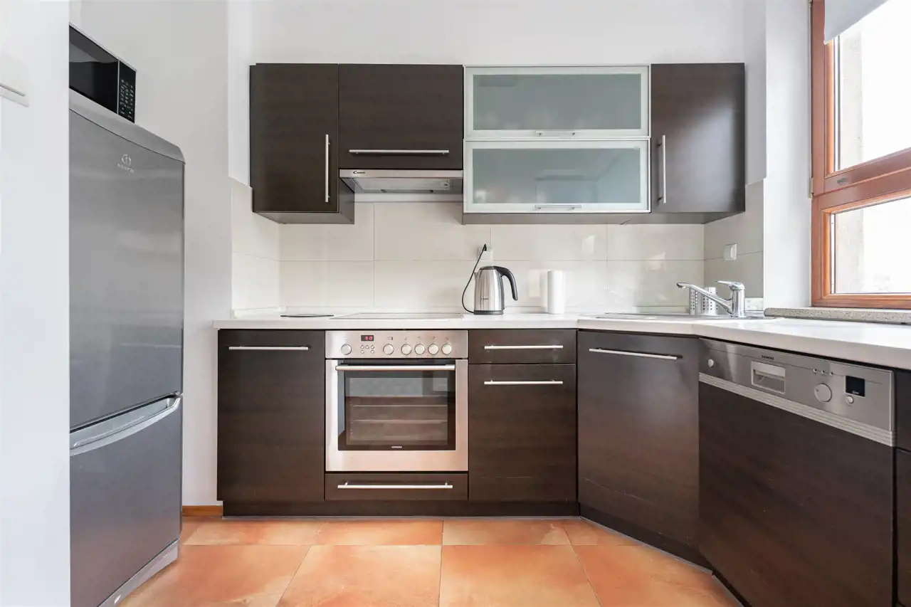 Mieszkanie całkowicie umeblowane - w salonie znajdziemy wygodną kanapę rogową, stolik kawowy, stół z krzesłami, TV. Kuchnia wyposażona we wszystkie niezbędne sprzęty m.in. lodówka, piekarnik, płyta indukcyjna, zmywarka. W sypialni znajdziemy duże, małżeńskie łóżko oraz pojemną szafę. Łazienka z prysznicem, pralką, WC i umywalką. Dodatkowo w przedpokoju miejsce znalazły dwie szafy w zabudowie.
