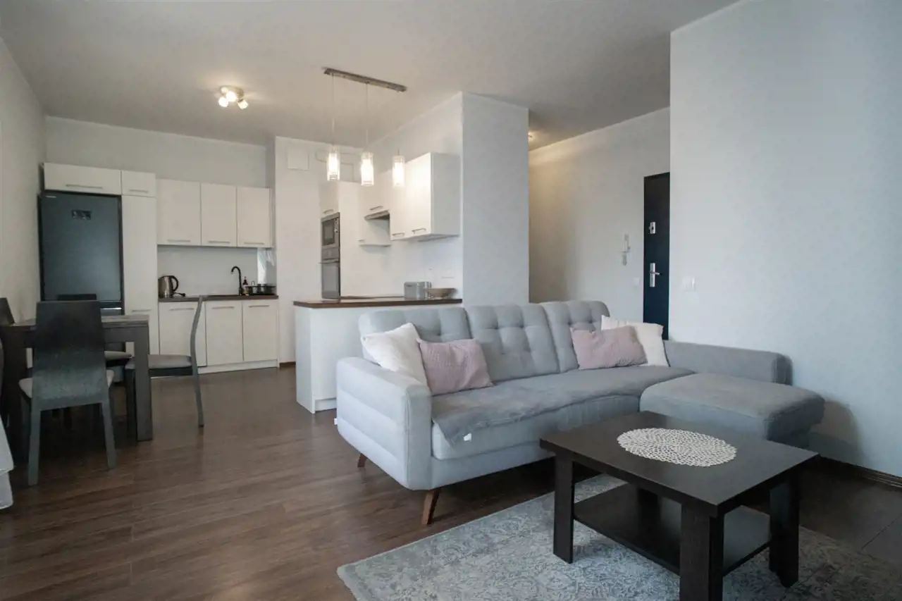 Salon posiada komfortowy wypoczynek z funkcją spania, stolik, szafkę RTV i TV. Salon połączony z aneksem kuchennym, wyposażonym we wszystkie niezbędne sprzęty: lodówka z zamrażarką, piekarnik, płyta, okap, zmywarka oraz wyposażenie kuchenne. Wszystkie sprzęty oraz cała zabudowa w bardzo dobrym stanie, niezużyte. Dużym atutem mieszkania jest balkon o powierzchni około 5 m2 z wystawą na przepięknie zagospodarowane i zadbane osiedle.