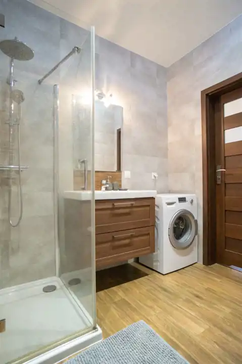 Sypialnia wyposażona w łóżko dwuosobowe, stolik nocny oraz pojemną szafę. Łazienka wyposażona w duży prysznic, WC oraz pralkę, dodatkowo funkcjonalne szafki.