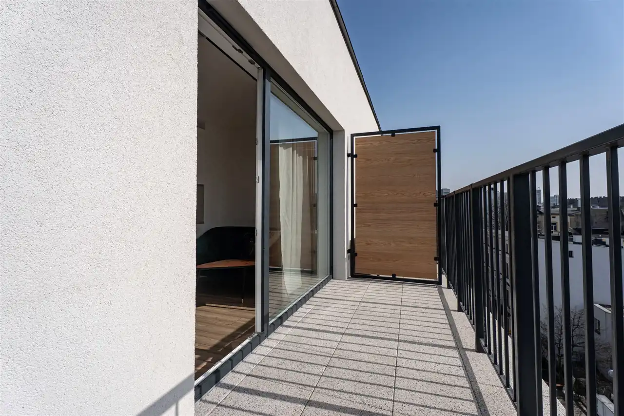 Mieszkanie składa się z 2 pokoi: salonu z aneksem kuchennym, sypialni, łazienki razem z WC oraz przedpokoju. Dodatkowym atutem mieszkania jest przestronny balkon (ok. 5 m2) z ekspozycją południową, z którego rozpościera się panorama miasta. Mieszkanie bardzo słoneczne.