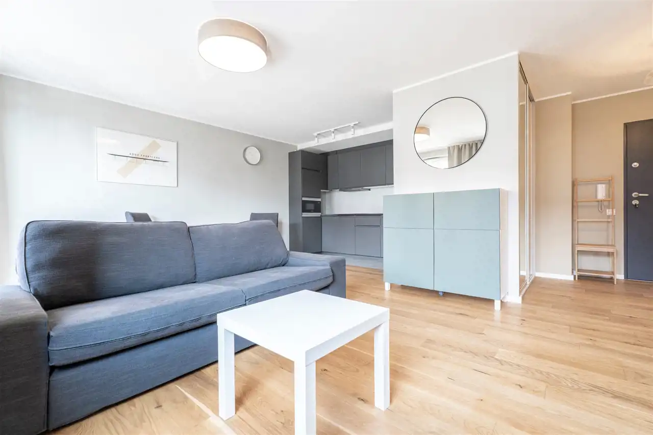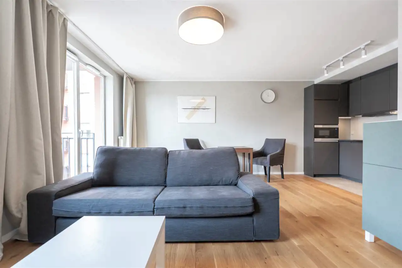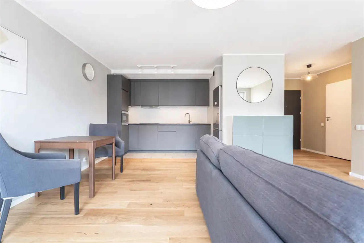 Salon z aneksem kuchennym: W pełni wyposażony aneks z lodówko-zamrażarka, płytą indukcyjną, a także zmywarką. W części wypoczynkowej znajduje się wygodna kanapa oraz rozkładany stół z krzesłami. Z salonu wyjście na balkon.