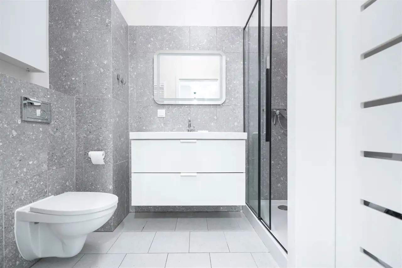 Łazienka: Nowoczesna, z pralką i przestronnym prysznicem.
