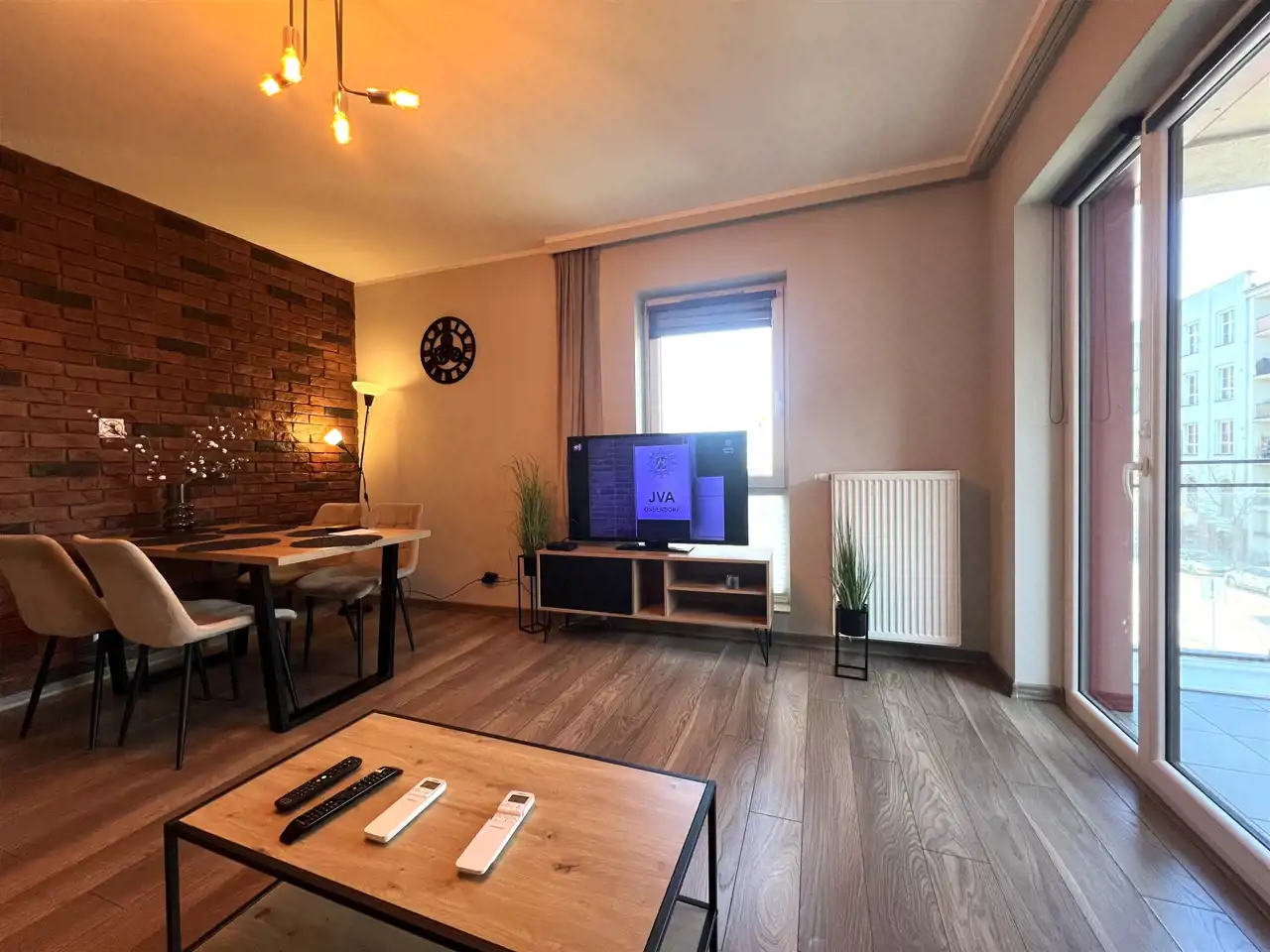 - SALON: kanapa narożna, stolik, komoda, szafka RTV, telewizor HITACHI, szafa, wyjście na BALKON typu loggia, klimatyzator,