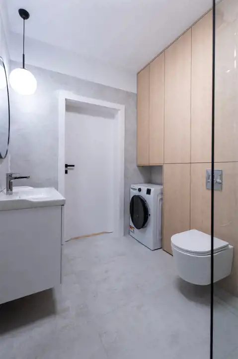 W salonie znajdziemy wygodną rozkładaną kanapę, szafkę RTV oraz stół z krzesłami. Aneks kuchenny wyposażony w lodówko-zamrażarkę, zmywarkę, piekarnik, płytę indukcyjną. W sypialni znajduje się dwuosobowe łóżko oraz pakowna szafa. Toaleta z prysznicem typu walk-in, umywalką, pralką oraz WC. Dodatkowo w przedpokoju znajduje się pakowna szafa z licznym miejscem do przechowywania.