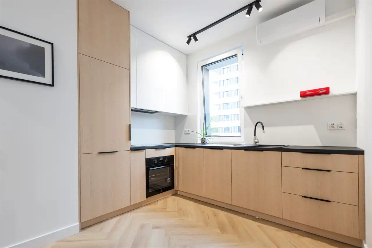 Apartament składa się z salonu z aneksem kuchennym, sypialni, łazienki razem z WC oraz przedpokoju. Całość wykończona bardzo gustownie przy użyciu materiałów wysokiej jakości. Mieszkanie klimatyzowane. Atutem mieszkania jest duża przestrzeń do przechowywania oraz bliskość terenów zielonych oraz rekreacyjnych bezpośrednio przy osiedlu.