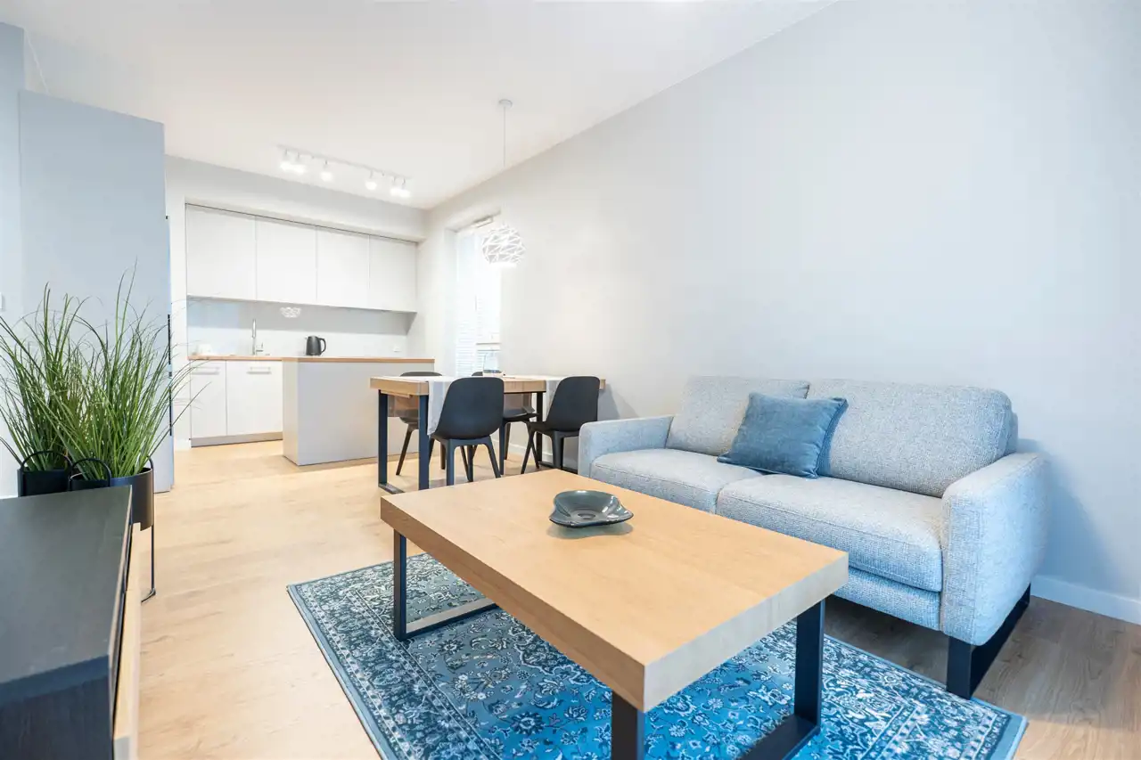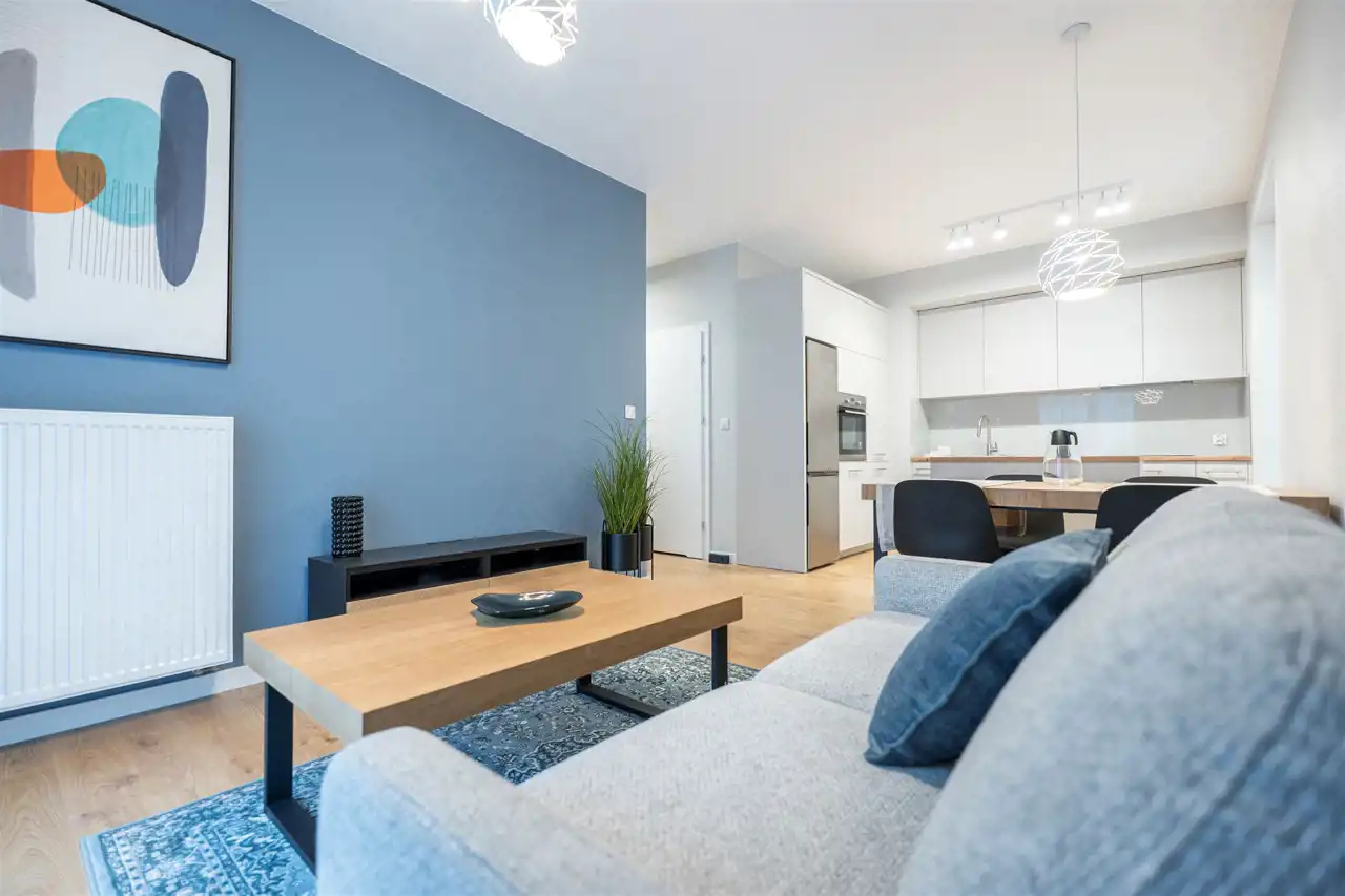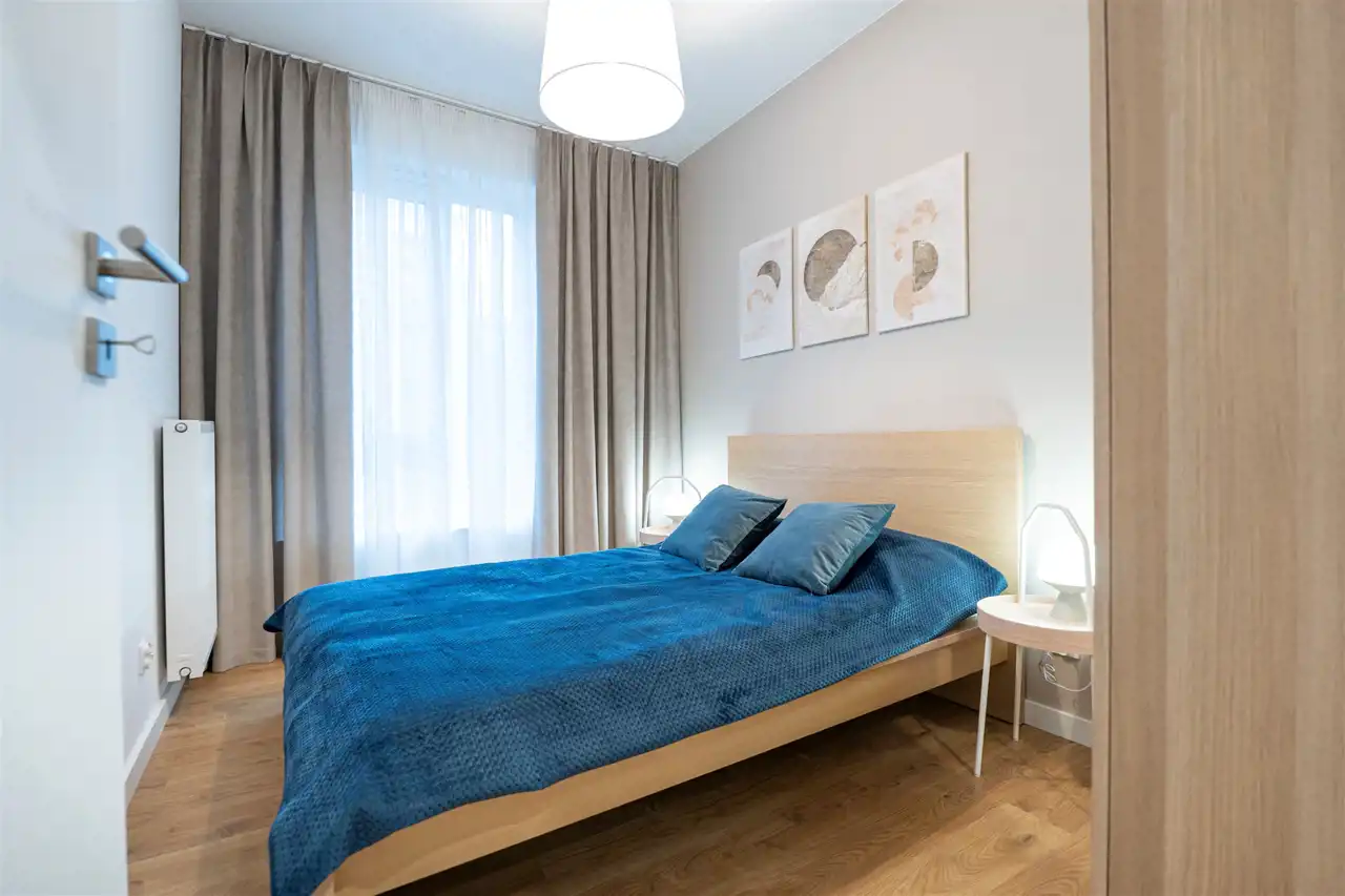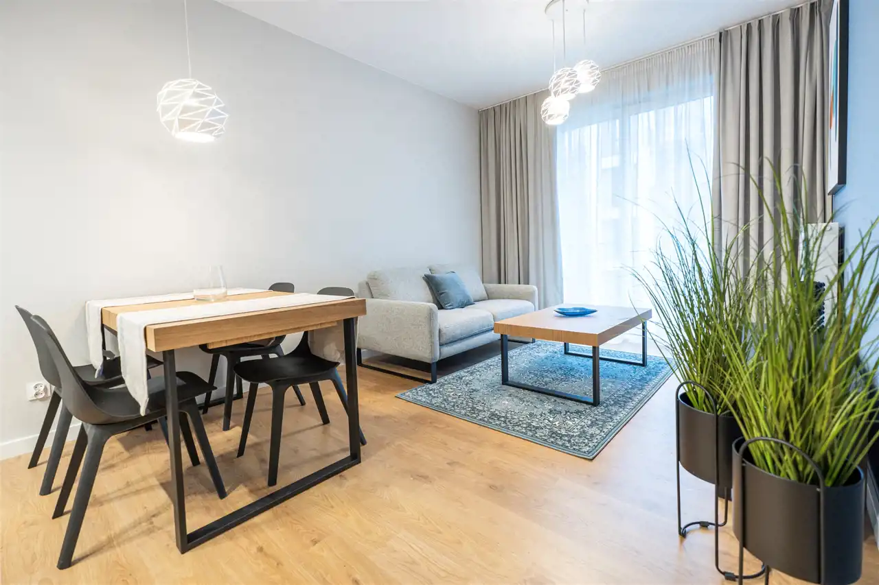 Apartament o powierzchni ok. 50 m2 składa się z salonu z aneksem kuchennym, dwóch sypialni - główna sypialnia, przedpokoju oraz łazienki z WC. Do dyspozycji najemcy siłownia w budynku i strefa coworkingowa ze strefą do pracy.