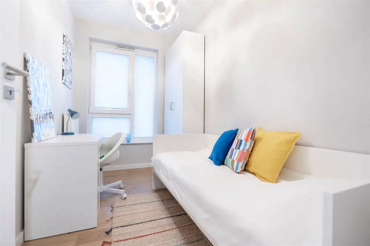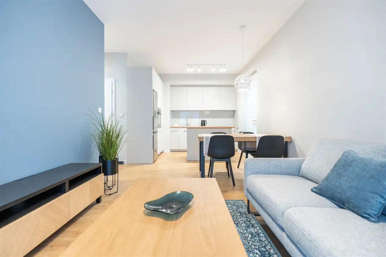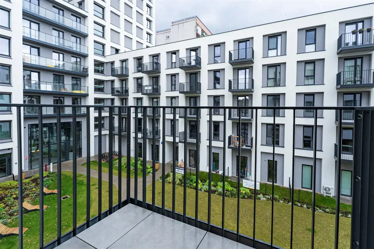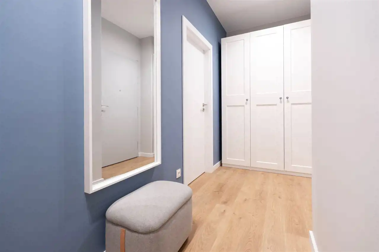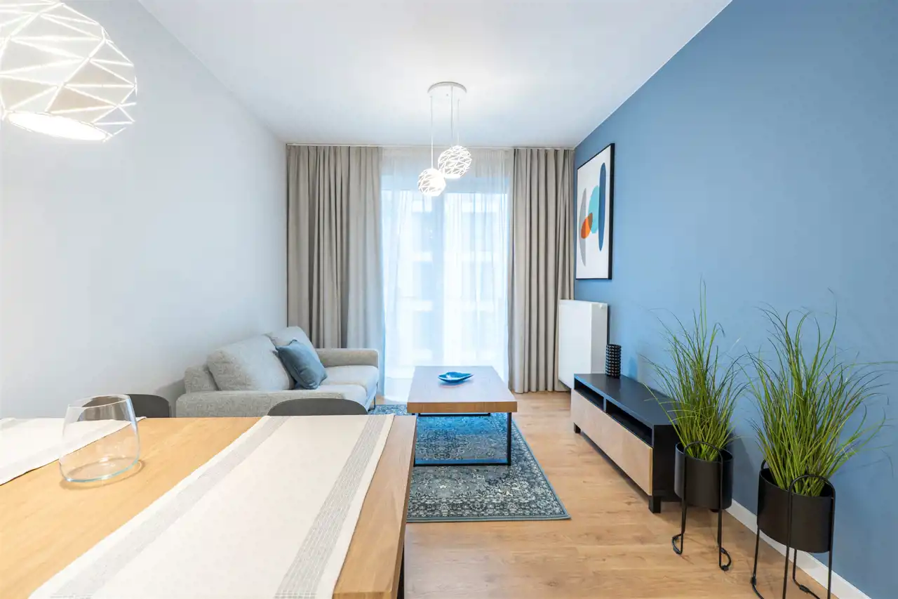 Apartament o powierzchni ok. 50 m2 składa się z salonu z aneksem kuchennym, dwóch sypialni - główna sypialnia, przedpokoju oraz łazienki z WC. Do dyspozycji najemcy siłownia w budynku i strefa coworkingowa ze strefą do pracy.