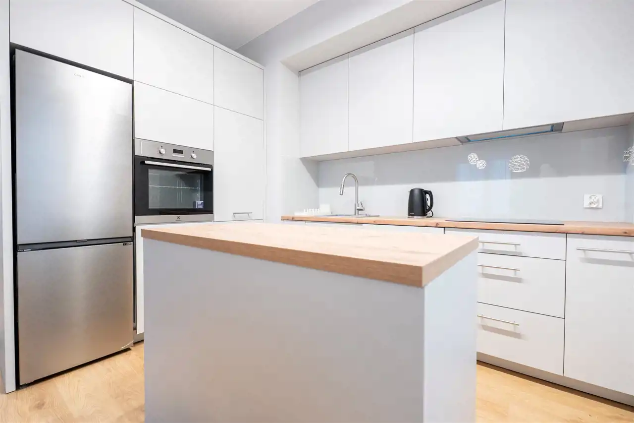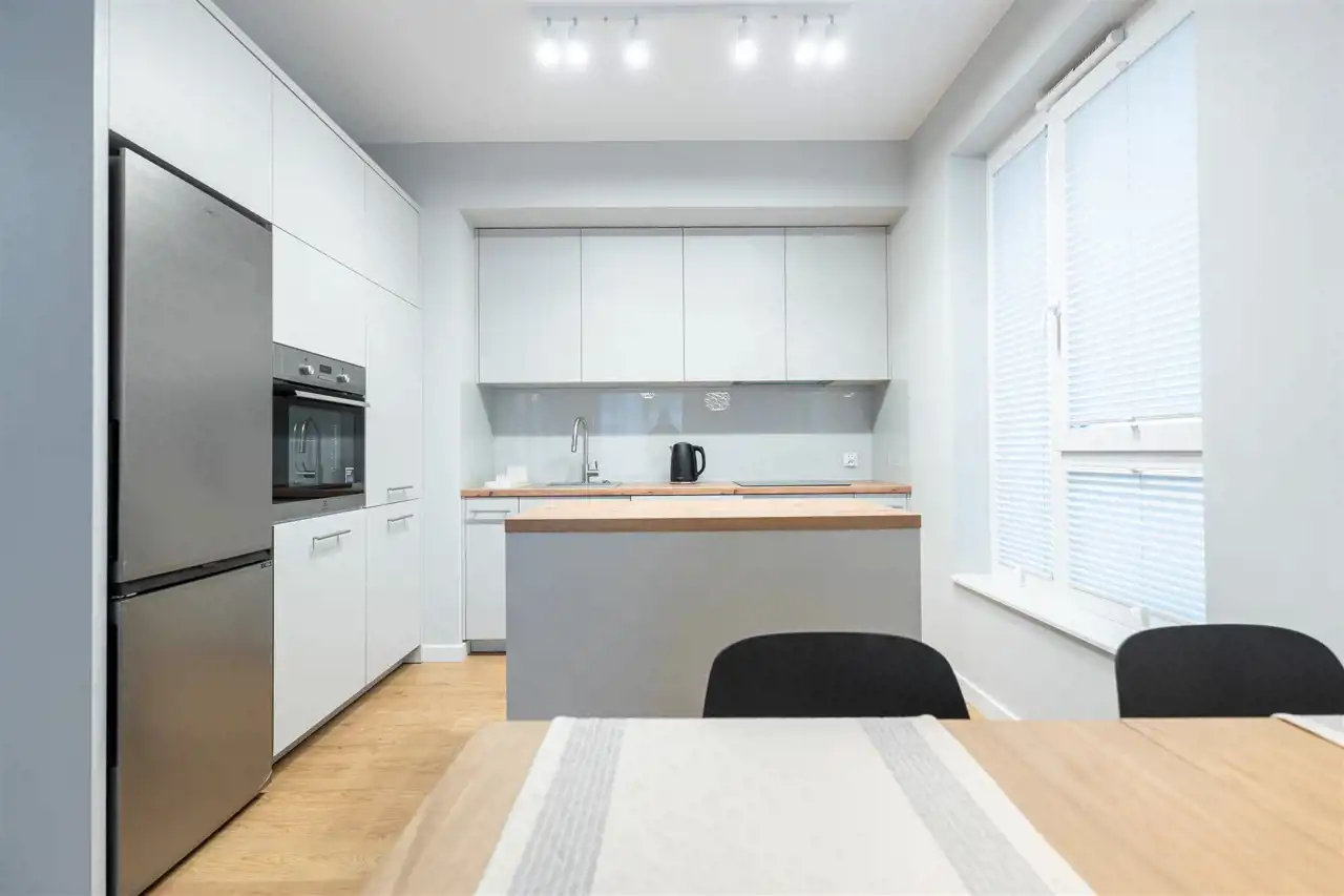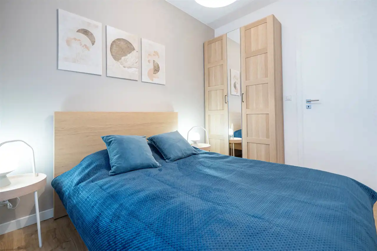 Salon wyposażony został w komfortową sofę, szafkę RTV, stół z krzesłami, stolik kawowy oraz dodatki nadające charakter mieszkaniu. Aneks kuchenny posiada wszystkie niezbędne sprzęty: lodówkę z zamrażarką, zmywarkę 60', płytę indukcyjną i piekarnik, okap oraz podstawowy komplet naczyń (nowe, nieużywane), a także pralka. W sypialni łóżko dwuosobowe, z komfortowym wygodnym materacem, pojemna szafa oraz szafki nocne z oświetlenie. Druga sypialnia wyposażona została w pojedyncze łóżko, biurko, szafę. W łazience kabina z deszczownicą oraz umywalka z szafką i lustrem w zabudowie. Dodatkowym atutem mieszkania są pojemne i funkcjonalne szafy na korytarzu.